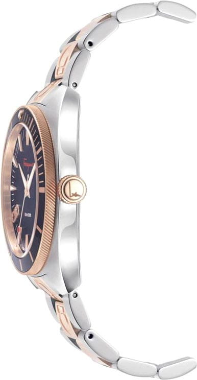 Мужские итальянские часы с сапфировым стеклом Salvatore Ferragamo Experience SFMG00521, кварцевый механизм с высокой точностью. Сапфировое стеклоСапфировое стеклоПрочный и надёжный материал из кристалла сапфира синтетического происхождения, характеризующийся особой твёрдостью и устойчивостью к царапинам и повреждениям. устойчивое к появлению царапин, обладающее высокой прозрачностью. Класс водозащиты: 100 метров, позволит плавать, нырять и заниматься другими водными видами спорта. Корпус часов изготовлен из стали. Задняя крышка украшена выгравированным изображением дворца ''Palazzo Spini Ferroni''.  Браслет часов изготовлен из стали с  частичным IP-покрытиемIP-покрытиеМетод ионного напыления. Демонстрирует повышенную устойчивость к истиранию, окислению и химическим веществам. Под воздействием высокого давления и температуры около 1500°C молекулы металла надёжно соединяются с частицами корпуса часов.. Отображение даты.