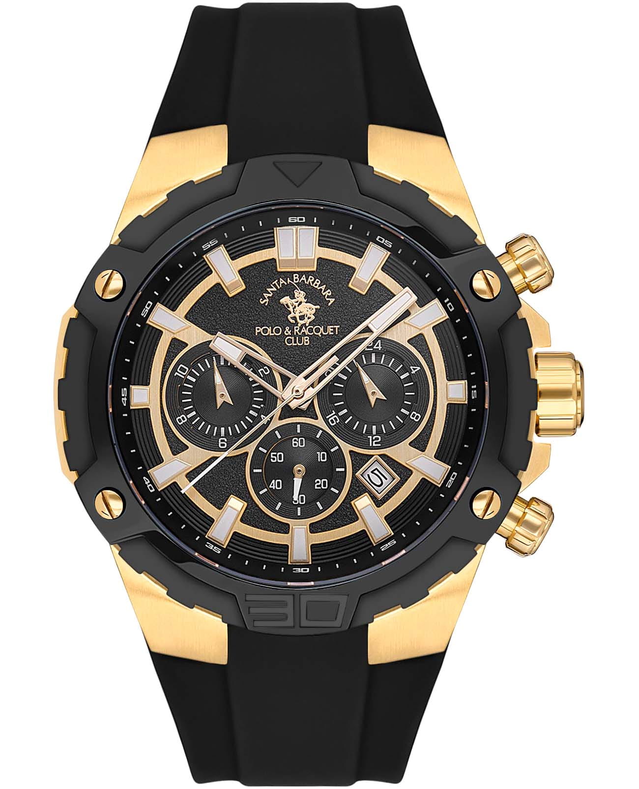 Мужские кварцевые Santa Barbara Polo & Racquet Club SB.5.10002-5 — воплощение элегантности и технического совершенства. Корпус из нержавеющей стали с IP-покрытиемIP-покрытиеМетод ионного напыления. Демонстрирует повышенную устойчивость к истиранию, окислению и химическим веществам. Под воздействием высокого давления и температуры около 1500°C молекулы металла надёжно соединяются с частицами корпуса часов., диаметром 47 мм, что делает их устойчивыми к внешним воздействиям и придает благородный вид. Неподвижный безельБезельВнешний ободок, закрепляющий стекло. В спортивных часах так называется поворотное кольцо с делениями на циферблате, выполняет роль таймера – замеряет отрезки времени на шкале. Неподвижный безель – элемент декора. Однонаправленно вращающийся безель на дайверских часах позволяет фиксировать моменты погружения и выныривания на поверхность. с IP-покрытиемIP-покрытиеМетод ионного напыления. Демонстрирует повышенную устойчивость к истиранию, окислению и химическим веществам. Под воздействием высокого давления и температуры около 1500°C молекулы металла надёжно соединяются с частицами корпуса часов. черного цвета. Стрелки и метки с люминесцентным покрытиемЛюминесцентное покрытиеПозволяет считывать показания времени в темноте. Производители наносят на стрелки, часовые индексы, безель или поверхность циферблата светонакопительный состав, дающий холодное свечение., обеспечивающим хорошую читаемость в темноте. Циферблат защищён минеральным стекломМинеральное стеклоМинеральное стекло представляет собой искусственно выращенный минерал кварца. Такое стекло отличается особой устойчивостью к повреждениям и царапинам. Уступает по некоторым качествам сапфировому стеклу. устойчивое к царапинам и механическим повреждениям. 12-ти и 24-х часовой формат времени. Окошко даты находится между отметками 4 и 5 часов. Силиконовый ремешок на стандартной застёжке обеспечивает комфортное и безопасное ношение. Водонепроницаемость 100 метров позволит плавать, нырять и заниматься другими водными видами спорта. Идеальный выбор для тех, кто ценит элегантный дизайн и качество.
