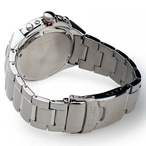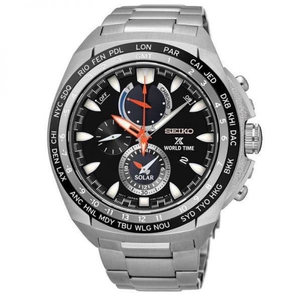 Чёрно-серебристая модель дополнена браслетом их стали 316L. Работу часов обеспечивает японский кварцевый механизм V195, реализуется питание по технологии . Опции: секундомер, мировое времяМировое время Полезное часовое усложнение, отображающее время в основных городах и известных областях по всему миру, оно связано с часовыми поясами, удобно для путешественников и бизнесменов. , календарь, хронографХронографФункция позволяет измерять отрезки времени с особой точностью: часы, минуты, секунды. Верным признаком хронографа является наличие на циферблате 3 дополнительных окошек-счётчиков.. На стрелки и метки нанесено люминесцентное покрытиеЛюминесцентное покрытиеПозволяет считывать показания времени в темноте. Производители наносят на стрелки, часовые индексы, безель или поверхность циферблата светонакопительный состав, дающий холодное свечение.. Минеральное стекло Hardlex устойчиво к царапинам.
