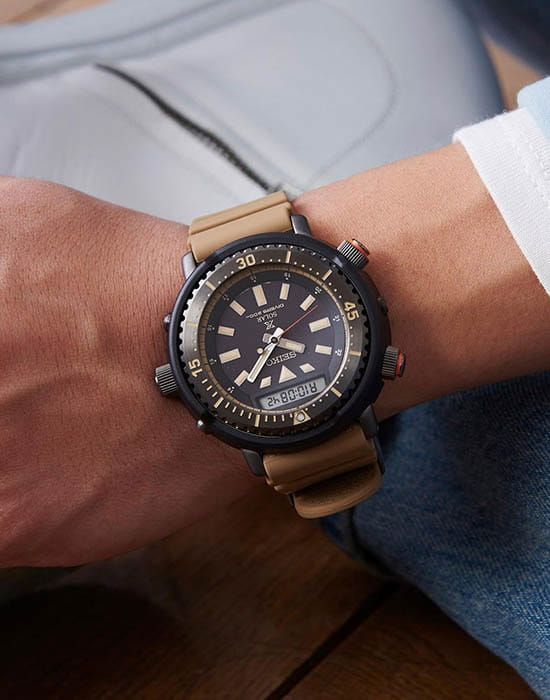 Японские мужские часы Seiko SNJ029P1 из коллекции Prospex стали перевоплощением легендарного хронографаХронографФункция позволяет измерять отрезки времени с особой точностью: часы, минуты, секунды. Верным признаком хронографа является наличие на циферблате 3 дополнительных окошек-счётчиков. 80-х годов, который предпочитал носить актёр Арнольд Шварценеггер. Наручные часы отражают брутальный, спортивный характер. Внешний облик позаимствован у предшественника Seiko H558-5009, выполненный в дайверском стиле. Аксессуар работает за счёт японского кварцевого калибра Seiko H851, получающего энергию за счёт источников света – реализация технологии . При полностью заряженном элементе питания модель проработает 6 месяцев без необходимости подзарядки. Противоударный корпусУдаропрочный корпусМеханизм заключён в корпус, выполненный из современных материалов, устойчивых к ударам, механическим повреждениям и падению с высоты: инновационный пластик, карбон, нержавеющая сталь, титан. имеет двойную конструкцию, где нержавеющая сталь 316L дополнительно защищена полимерными протекторами. Циферблат оснащён минеральным закаленным стеклом Hardlex, прочным и устойчивым к царапинам. Сохраняется водостойкость до 200 метров в соответствии со стандартом ISO 6425. Дисплей подсвечивается светодиодомСветодиодная подсветкаСветодиодная или LED-подсветка обеспечивает появление яркого холодного свечения за счёт LED-элементов - маленьких лампочек. Они потребляют минимальное количество энергии, чаще всего можно встретить 1 светодиод, в нижней части циферблата., стрелки и индексы имеют люминесцентную подсветкуЛюминесцентное покрытиеПозволяет считывать показания времени в темноте. Производители наносят на стрелки, часовые индексы, безель или поверхность циферблата светонакопительный состав, дающий холодное свечение.. Функции: будильник, секундомер, вечный календарьВечный календарьКлассическое часовое усложнение, представляющее собой календарь, рассчитанный на несколько лет вперёд (стандартно – до 2099 года). Определяет текущую дату, день недели, месяц.. Диаметр корпуса: 47,8 мм.