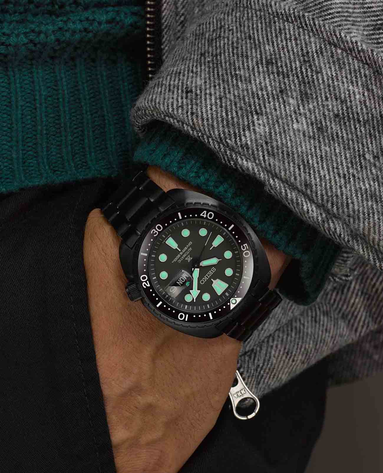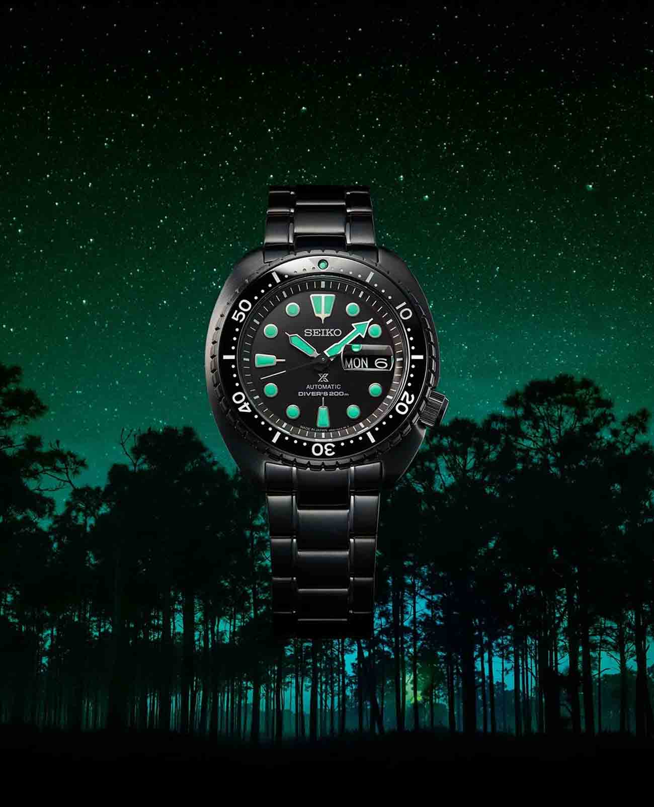 Стрелки и метки покрыты люминесцентным покрытиемЛюминесцентное покрытиеПозволяет считывать показания времени в темноте. Производители наносят на стрелки, часовые индексы, безель или поверхность циферблата светонакопительный состав, дающий холодное свечение., благодаря которому показания хорошо видны даже в темное время суток. Класс водозащиты — 200 метров, что дает возможность плавать, нырять и заниматься любыми водными активностями без опасений за сохранность часов.