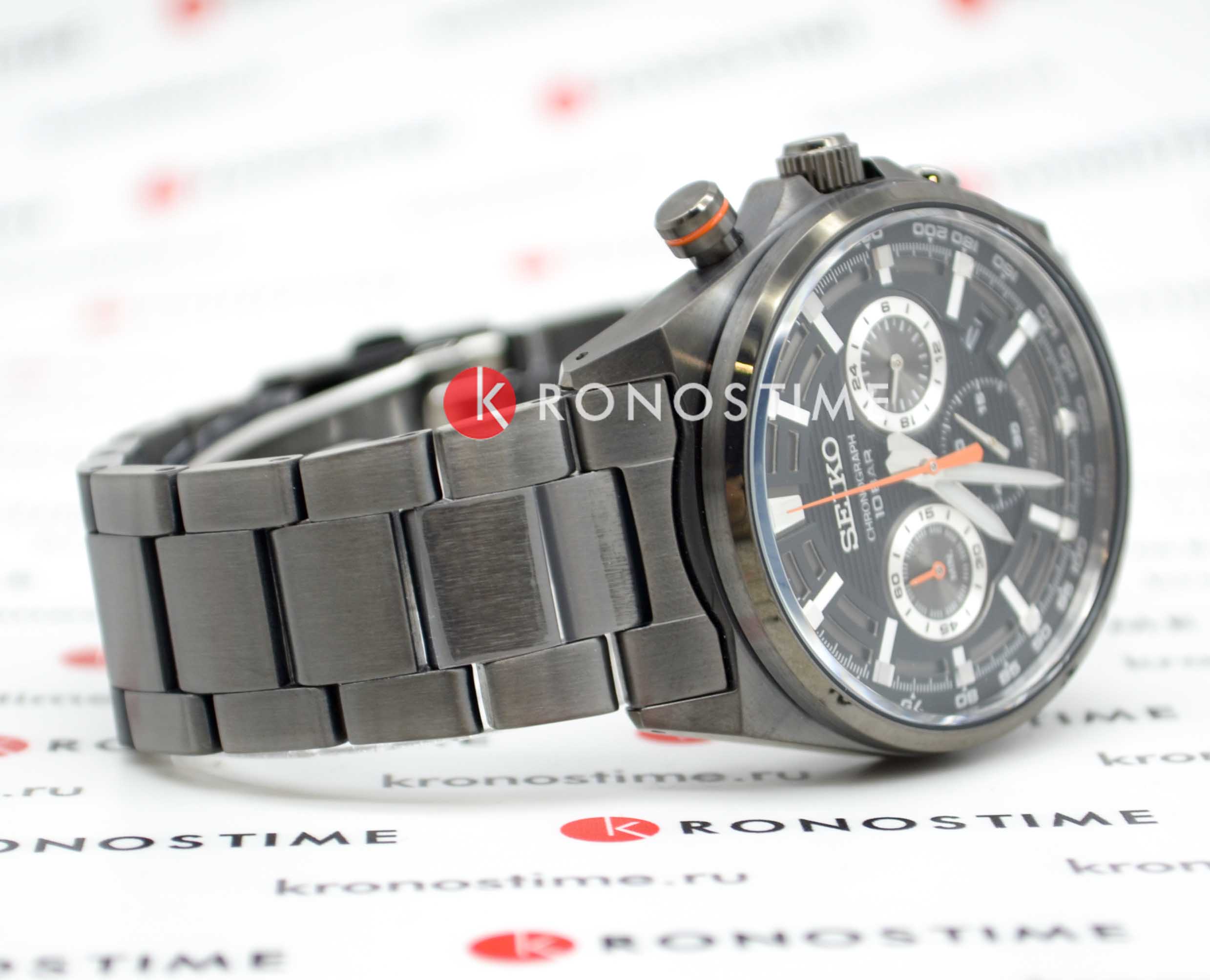Мужские японские часы Seiko SSB399P1 c хронографомХронографФункция позволяет измерять отрезки времени с особой точностью: часы, минуты, секунды. Верным признаком хронографа является наличие на циферблате 3 дополнительных окошек-счётчиков., кварцевый механизм с высокой точностью. Минеральное стеклоМинеральное стеклоМинеральное стекло представляет собой искусственно выращенный минерал кварца. Такое стекло отличается особой устойчивостью к повреждениям и царапинам. Уступает по некоторым качествам сапфировому стеклу., устойчивое к появлению царапин, обладающее высокой прозрачностью. Класс водозащиты: 100 метров, позволит плавать, нырять и заниматься другими водными видами спорта. Корпус и браслет часов изготовлены из стали с PVD-покрытиемPVDУльтратонкое покрытие наносится в технике вакуумного напыления, сочетает в себе нитрид титана особой прочности со слоем золота или оксида хрома. Несёт в себе декоративную или защитную функцию.. Неподвижный безельБезельВнешний ободок, закрепляющий стекло. В спортивных часах так называется поворотное кольцо с делениями на циферблате, выполняет роль таймера – замеряет отрезки времени на шкале. Неподвижный безель – элемент декора. Однонаправленно вращающийся безель на дайверских часах позволяет фиксировать моменты погружения и выныривания на поверхность. со шкалой тахиметраТахиметрРазмеченная шкала, располагается на ободке или безеле часов. Тахиметр позволяет рассчитать скорость на определённом участке пути, расстояние измеряется в километрах или милях.. Стрелки и метки с люминесцентным покрытиемЛюминесцентное покрытиеПозволяет считывать показания времени в темноте. Производители наносят на стрелки, часовые индексы, безель или поверхность циферблата светонакопительный состав, дающий холодное свечение. LumiBrite. Браслет на раскладной застёжкеРаскладная застёжкаТакой тип застёжки используется только на браслетах из металла. Она никогда не раскрывается полностью, происходит разделение на 2 и более частей. Раскладывающая застёжка снизит вероятность потери часов к минимуму. с кнопками. СекундомерСекундомерСекундоме́р — прибор, способный измерять интервалы времени с точностью до долей секунды.. Окошко даты находится в положении между 4 и 5 часов.
