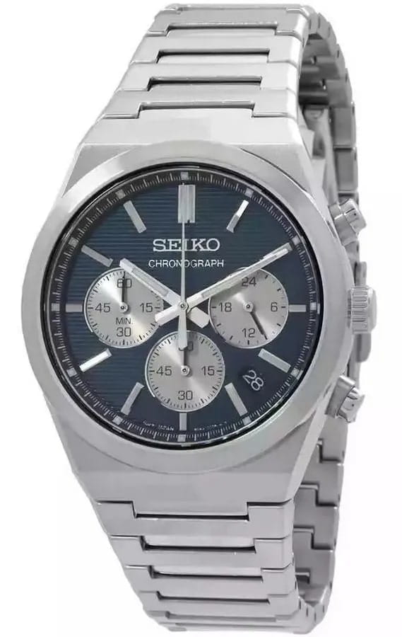 Мужские японские часы Seiko SSB453P1 c хронографомХронографФункция позволяет измерять отрезки времени с особой точностью: часы, минуты, секунды. Верным признаком хронографа является наличие на циферблате 3 дополнительных окошек-счётчиков., кварцевый механизм с высокой точностью. Минеральное стеклоМинеральное стеклоМинеральное стекло представляет собой искусственно выращенный минерал кварца. Такое стекло отличается особой устойчивостью к повреждениям и царапинам. Уступает по некоторым качествам сапфировому стеклу., устойчивое к появлению царапин, обладающее высокой прозрачностью. Класс водозащиты: 100 метров, позволит плавать, нырять и заниматься другими водными видами спорта. Корпус и браслет часов изготовлен из стали. Неподвижный безельБезельВнешний ободок, закрепляющий стекло. В спортивных часах так называется поворотное кольцо с делениями на циферблате, выполняет роль таймера – замеряет отрезки времени на шкале. Неподвижный безель – элемент декора. Однонаправленно вращающийся безель на дайверских часах позволяет фиксировать моменты погружения и выныривания на поверхность. со шкалой тахиметраТахиметрРазмеченная шкала, располагается на ободке или безеле часов. Тахиметр позволяет рассчитать скорость на определённом участке пути, расстояние измеряется в километрах или милях.. Стрелки и метки с люминесцентным покрытиемЛюминесцентное покрытиеПозволяет считывать показания времени в темноте. Производители наносят на стрелки, часовые индексы, безель или поверхность циферблата светонакопительный состав, дающий холодное свечение. LumiBrite. Браслет на раскладной застёжкеРаскладная застёжкаТакой тип застёжки используется только на браслетах из металла. Она никогда не раскрывается полностью, происходит разделение на 2 и более частей. Раскладывающая застёжка снизит вероятность потери часов к минимуму. с кнопками. СекундомерСекундомерСекундоме́р — прибор, способный измерять интервалы времени с точностью до долей секунды.. Окошко даты находится в положении между 4 и 5 часов.