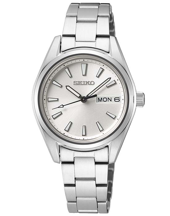 Женские японские часы Seiko CS Dress SUR349P1 c кварцевым механизм с высокой точностью. Сапфировое стеклоСапфировое стеклоПрочный и надёжный материал из кристалла сапфира синтетического происхождения, характеризующийся особой твёрдостью и устойчивостью к царапинам и повреждениям., устойчивое к появлению царапин, обладающее высокой прозрачностью. Класс водозащиты: 100 метров, позволит плавать, нырять и заниматься другими водными видами спорта. Корпус и браслет часов изготовлен из стали. Окошко даты и дня недели находится в положении 3 часа. Браслет с раскладной застёжкойРаскладная застёжкаТакой тип застёжки используется только на браслетах из металла. Она никогда не раскрывается полностью, происходит разделение на 2 и более частей. Раскладывающая застёжка снизит вероятность потери часов к минимуму.. Стрелки и метки с люминесцентным покрытиемЛюминесцентное покрытиеПозволяет считывать показания времени в темноте. Производители наносят на стрелки, часовые индексы, безель или поверхность циферблата светонакопительный состав, дающий холодное свечение. LumiBrite.