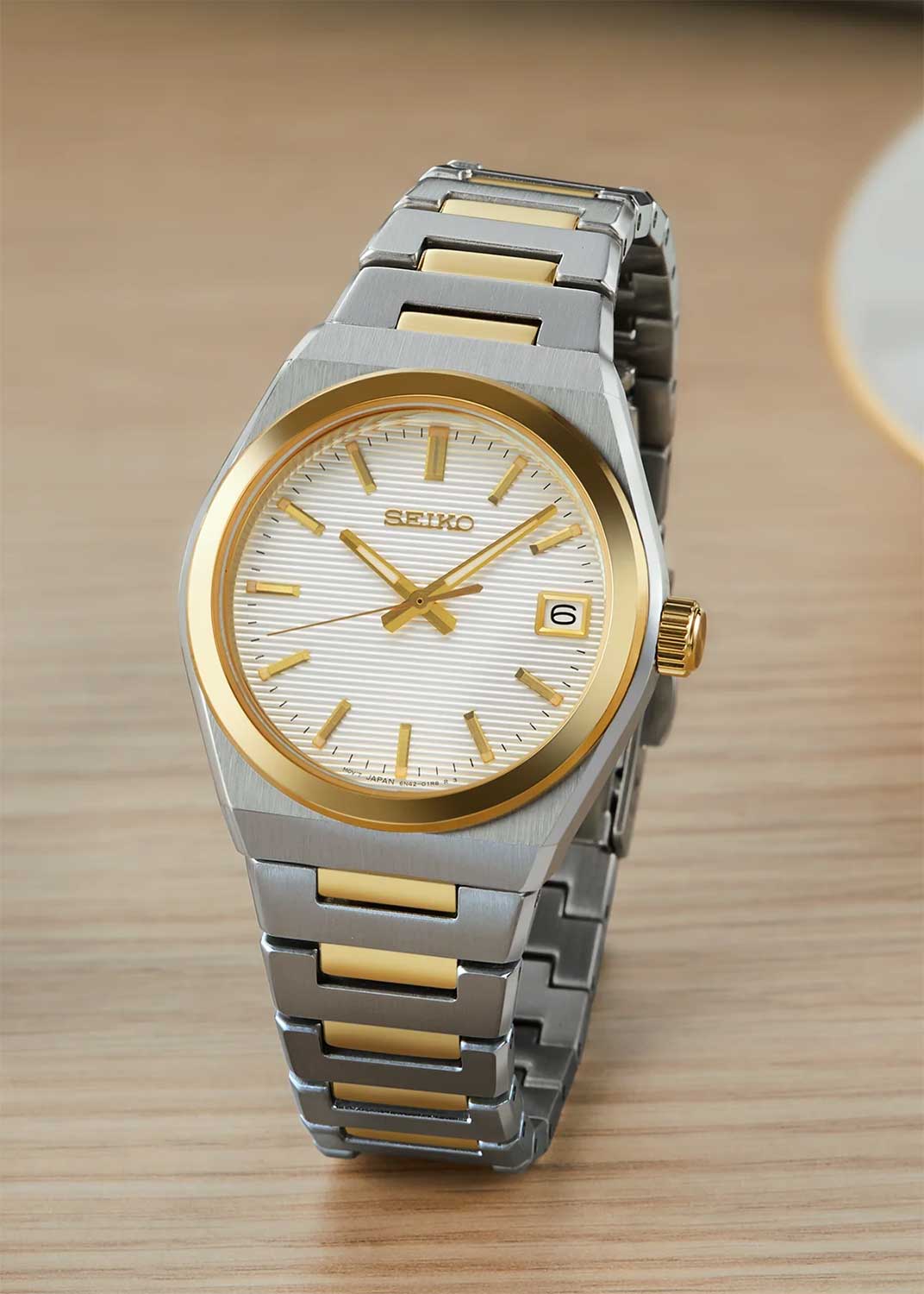 Женские японские часы Seiko Discover More SUR578 c кварцевым механизмом с высокой точностью с калибром 6N42. Сапфировое стеклоСапфировое стеклоПрочный и надёжный материал из кристалла сапфира синтетического происхождения, характеризующийся особой твёрдостью и устойчивостью к царапинам и повреждениям., устойчивое к появлению царапин, обладающее высокой прозрачностью. Класс водозащиты: 100 метров, позволит плавать, нырять и заниматься другими водными видами спорта. Корпус диаметром 34 мм и браслет часов изготовлен из нержавеющей стали с PVDPVDУльтратонкое покрытие наносится в технике вакуумного напыления, сочетает в себе нитрид титана особой прочности со слоем золота или оксида хрома. Несёт в себе декоративную или защитную функцию. покрытием. Циферблат представлен с метками в виде штрихов. Стрелки и метки с люминесцентным покрытиемЛюминесцентное покрытиеПозволяет считывать показания времени в темноте. Производители наносят на стрелки, часовые индексы, безель или поверхность циферблата светонакопительный состав, дающий холодное свечение. LumiBrite. Браслет с раскладной застёжкойРаскладная застёжкаТакой тип застёжки используется только на браслетах из металла. Она никогда не раскрывается полностью, происходит разделение на 2 и более частей. Раскладывающая застёжка снизит вероятность потери часов к минимуму. с фиксатором. Окошко даты находится в положении 3 часа. Seiko — это гармония изящного дизайна и технологичной надёжности, компактный и стильный выбор для повседневной классики.