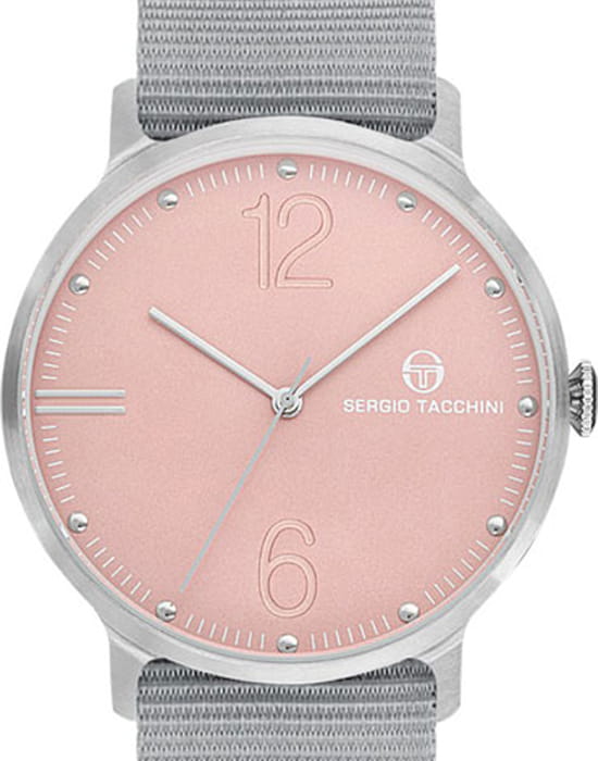 Sergio Tacchini — стильные мужские часы в минималистичном дизайне, подчеркивающем лёгкость и современность образа. Круглый корпус выполнен из нержавеющей стали, а циферблат оформлен крупными арабскими цифрами «6» и «12» и тонкими метками, что делает показания лёгкими для восприятия.