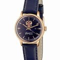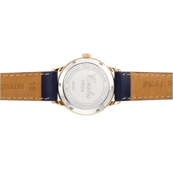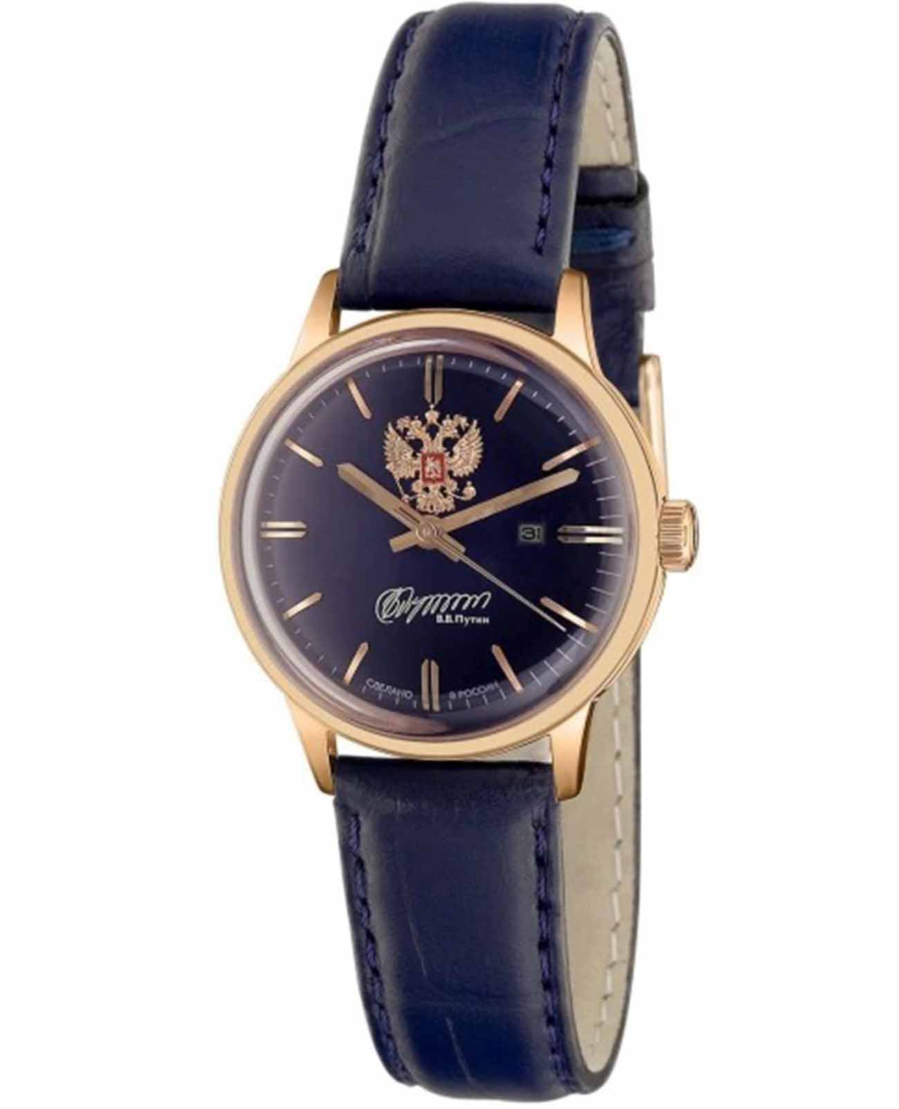 Российские механические наручные часы Слава 1873096/300-6Т15 станут стильным и надежным аксессуаром для вашего образа. Эти элегантные часы созданы с акцентом на высокое качество и изысканный дизайн. Оборудованные механизмом Miyota 6T15 с автоподзаводом, они обеспечивают точность и надежность, поддерживая запас хода до 40 часов. Часы заключены в прочный стальной корпус  с IP-покрытиемIP-покрытиеМетод ионного напыления. Демонстрирует повышенную устойчивость к истиранию, окислению и химическим веществам. Под воздействием высокого давления и температуры около 1500°C молекулы металла надёжно соединяются с частицами корпуса часов. диаметром 32 мм и минеральным стекломМинеральное стеклоМинеральное стекло представляет собой искусственно выращенный минерал кварца. Такое стекло отличается особой устойчивостью к повреждениям и царапинам. Уступает по некоторым качествам сапфировому стеклу., что обеспечивает надежную защиту и долговечность. Синий циферблат украшен изображением герба Российской Федерации и автографом В.В. Путина. Широкие заостренные стрелки в стиле Baton и штриховые метки придают циферблату выразительность и читаемость. Часы оснащены календарем с окошком даты на 3 часах, что делает их еще более функциональными. Рифленая заводная головка и завинчивающаяся задняя крышка добавляют изделию надежности и комфорта в использовании. Завершает образ текстурированный кожаный ремешок синего цвета с классической застежкой, который обеспечивает удобную посадку на запястье. Благодаря водозащите до 50WR, эти часы подойдут для повседневного использования, сохраняя свой безупречный вид и функциональность.