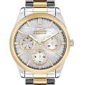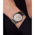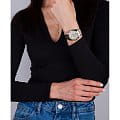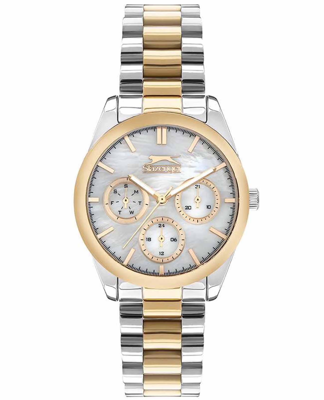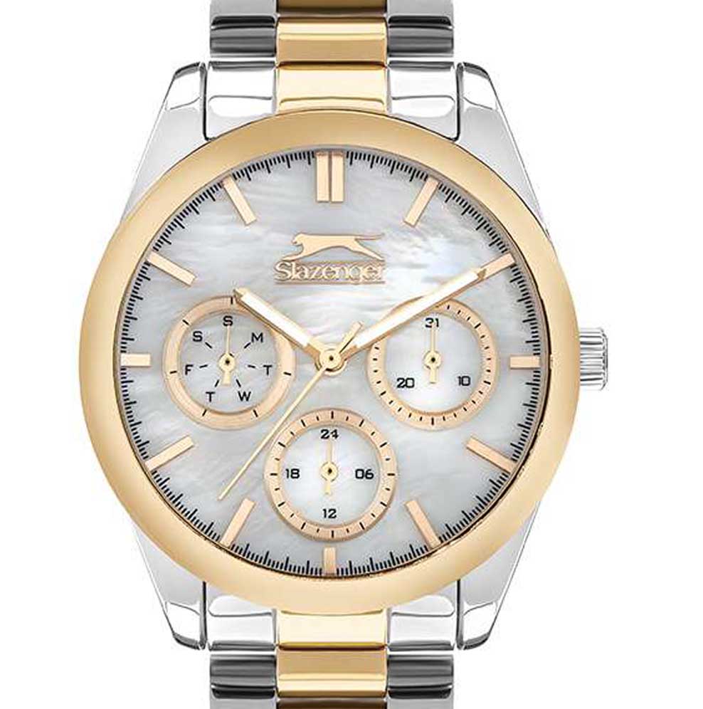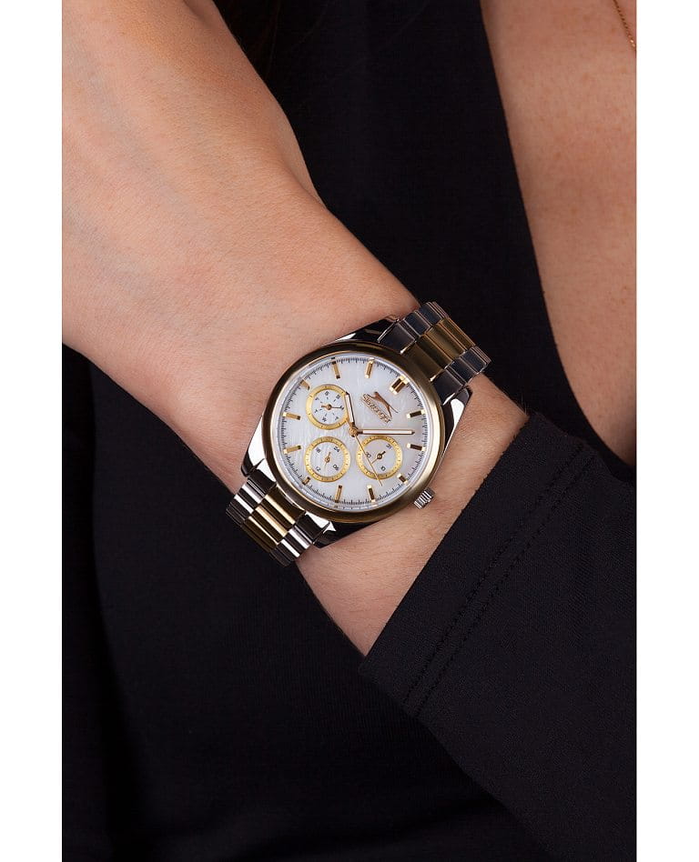 Женские наручные часы Slazenger SL.09.2063.4.05 сочетают в себе классический дизайн и высокое качество исполнения. Модель обладает круглым корпусом диаметром 36 мм, изготовленным из суперметалла, что обеспечивает устойчивость к внешним воздействиям. Браслет выполнен из суперметалла с частичным IP-покрытиемIP-покрытиеМетод ионного напыления. Демонстрирует повышенную устойчивость к истиранию, окислению и химическим веществам. Под воздействием высокого давления и температуры около 1500°C молекулы металла надёжно соединяются с частицами корпуса часов. на раскладной застёжкеРаскладная застёжкаТакой тип застёжки используется только на браслетах из металла. Она никогда не раскрывается полностью, происходит разделение на 2 и более частей. Раскладывающая застёжка снизит вероятность потери часов к минимуму.. Неподвижный безельБезельВнешний ободок, закрепляющий стекло. В спортивных часах так называется поворотное кольцо с делениями на циферблате, выполняет роль таймера – замеряет отрезки времени на шкале. Неподвижный безель – элемент декора. Однонаправленно вращающийся безель на дайверских часах позволяет фиксировать моменты погружения и выныривания на поверхность. из суперметалла с IP-покрытиемIP-покрытиеМетод ионного напыления. Демонстрирует повышенную устойчивость к истиранию, окислению и химическим веществам. Под воздействием высокого давления и температуры около 1500°C молекулы металла надёжно соединяются с частицами корпуса часов. цвета желтого золота. Перламутровый циферблат украшен логотипом бренда и метками времени. Имеются дополнительные малые циферблаты для отображения даты, дня недели и текущего времени в 24-часовом формате. Для защиты используется минеральное стеклоМинеральное стеклоМинеральное стекло представляет собой искусственно выращенный минерал кварца. Такое стекло отличается особой устойчивостью к повреждениям и царапинам. Уступает по некоторым качествам сапфировому стеклу., обеспечивающее прочную защиту от царапин. Стрелки и метки имеют люминесцентное покрытиеЛюминесцентное покрытиеПозволяет считывать показания времени в темноте. Производители наносят на стрелки, часовые индексы, безель или поверхность циферблата светонакопительный состав, дающий холодное свечение., что позволяет легко читать время в темноте. Часы работают на японском кварцевом механизме, который обеспечивает точность хода без необходимости подзаводки. Водонепроницаемость часов составляет 3 атмосферы (WR30), что позволяет защитить корпус от случайных брызг или капель дождя.