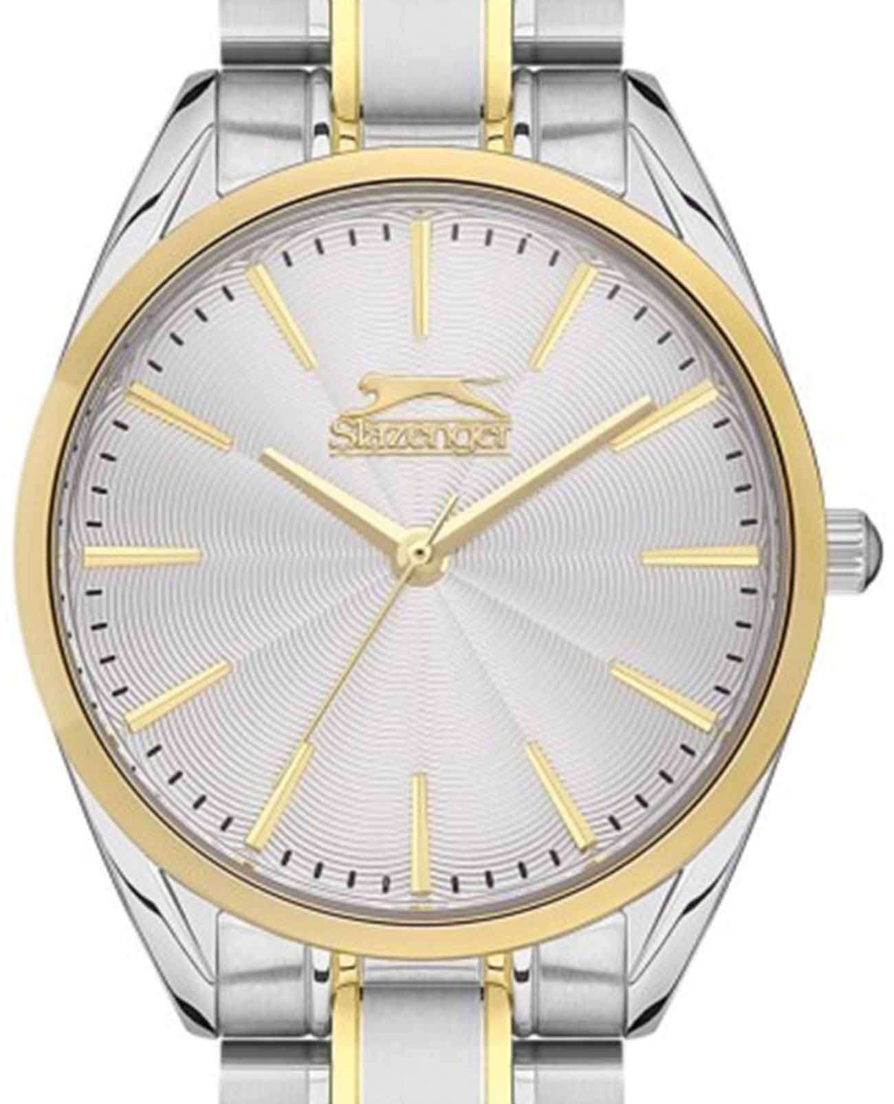 Эти стильные женские часы Slazenger SL.09.2155.3.03 идеально подчеркивают утонченный вкус своей обладательницы. Они оснащены надежным кварцевым механизмом, который обеспечивает точность хода. Корпус выполнен из качественного суперметалла, а безельБезельВнешний ободок, закрепляющий стекло. В спортивных часах так называется поворотное кольцо с делениями на циферблате, выполняет роль таймера – замеряет отрезки времени на шкале. Неподвижный безель – элемент декора. Однонаправленно вращающийся безель на дайверских часах позволяет фиксировать моменты погружения и выныривания на поверхность. с золотистым IP-покрытиемIP-покрытиеМетод ионного напыления. Демонстрирует повышенную устойчивость к истиранию, окислению и химическим веществам. Под воздействием высокого давления и температуры около 1500°C молекулы металла надёжно соединяются с частицами корпуса часов. придаёт аксессуару современный вид и дополнительную прочность. Минеральное стеклоМинеральное стеклоМинеральное стекло представляет собой искусственно выращенный минерал кварца. Такое стекло отличается особой устойчивостью к повреждениям и царапинам. Уступает по некоторым качествам сапфировому стеклу. надежно защищает циферблат от возможных повреждений. Серебристый циферблат выполнен по технологии Sunray, что создает эффект солнечных лучей и придает часам особую изысканность. Металлический браслет с частичным золотистым IP-покрытиемIP-покрытиеМетод ионного напыления. Демонстрирует повышенную устойчивость к истиранию, окислению и химическим веществам. Под воздействием высокого давления и температуры около 1500°C молекулы металла надёжно соединяются с частицами корпуса часов. и с раскладной застёжкойРаскладная застёжкаТакой тип застёжки используется только на браслетах из металла. Она никогда не раскрывается полностью, происходит разделение на 2 и более частей. Раскладывающая застёжка снизит вероятность потери часов к минимуму. обеспечивает комфортное и надежное прилегание к запястью. Диаметр корпуса составляет 32 мм, а толщина — всего 9 мм, что придаёт часам изящность и элегантность. Водозащита уровня WR 30 позволяет не беспокоиться о небольших брызгах, которые могут возникнуть в повседневной жизни. Вес часов составляет 78 грамм, что делает их легкими и удобными для ежедневного ношения. Эти часы станут идеальным аксессуаром, подчеркивающим стиль и индивидуальность современной женщины.