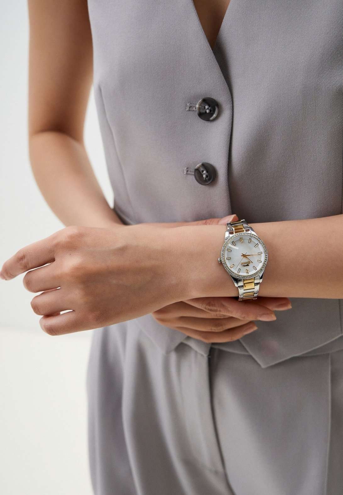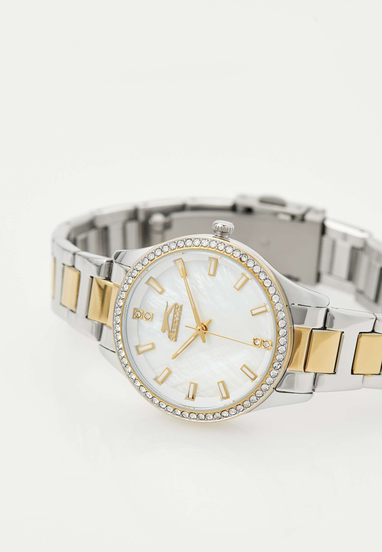 Элегантные наручные женские часы Slazenger SL.09.2222.3.03 созданы для тех, кто ценит стиль и изящество в каждом аксессуаре. Корпус диаметром 34 мм сделан из прочного металла, а безельБезельВнешний ободок, закрепляющий стекло. В спортивных часах так называется поворотное кольцо с делениями на циферблате, выполняет роль таймера – замеряет отрезки времени на шкале. Неподвижный безель – элемент декора. Однонаправленно вращающийся безель на дайверских часах позволяет фиксировать моменты погружения и выныривания на поверхность. с износостойким золотистым IP-покрытиемIP-покрытиеМетод ионного напыления. Демонстрирует повышенную устойчивость к истиранию, окислению и химическим веществам. Под воздействием высокого давления и температуры около 1500°C молекулы металла надёжно соединяются с частицами корпуса часов. усыпан фианитами, что придаёт аксессуару современный вид и долговечность. Циферблат украшен перламутровой отделкой и изящными фианитами, придающими модели особый блеск и шарм. Кварцевый механизм обеспечивает точность хода, а минеральное стеклоМинеральное стеклоМинеральное стекло представляет собой искусственно выращенный минерал кварца. Такое стекло отличается особой устойчивостью к повреждениям и царапинам. Уступает по некоторым качествам сапфировому стеклу. надежно защищает часы от случайных повреждений. Металлический браслет серебристого цвета c частичным золотистым IP-покрытиемIP-покрытиеМетод ионного напыления. Демонстрирует повышенную устойчивость к истиранию, окислению и химическим веществам. Под воздействием высокого давления и температуры около 1500°C молекулы металла надёжно соединяются с частицами корпуса часов. снабжен удобной раскладной застёжкойРаскладная застёжкаТакой тип застёжки используется только на браслетах из металла. Она никогда не раскрывается полностью, происходит разделение на 2 и более частей. Раскладывающая застёжка снизит вероятность потери часов к минимуму., что гарантирует комфортное ношение на запястье. Стрелки и метки снабжены люминесцентным покрытиемЛюминесцентное покрытиеПозволяет считывать показания времени в темноте. Производители наносят на стрелки, часовые индексы, безель или поверхность циферблата светонакопительный состав, дающий холодное свечение., что позволяет легко считывать время в темноте. Водозащита 3 ATM позволяет не беспокоиться о случайных брызгах и попадании влаги. Толщина корпуса составляет всего 10 мм, благодаря чему часы изящно смотрятся на запястье и не доставляют дискомфорта при носке. Эта модель станет отличным выбором для повседневных образов и особых случаев, подчеркивая индивидуальность и безупречный вкус своей обладательницы.