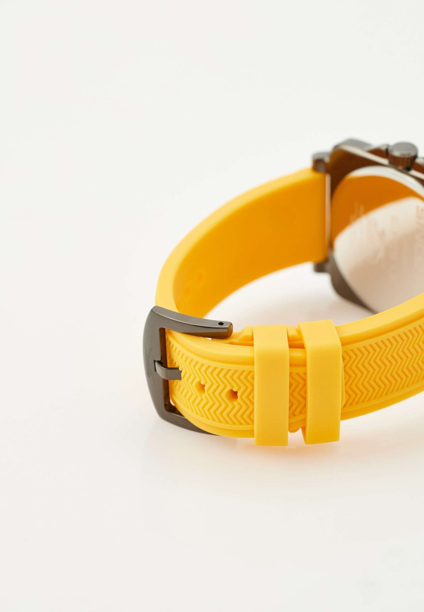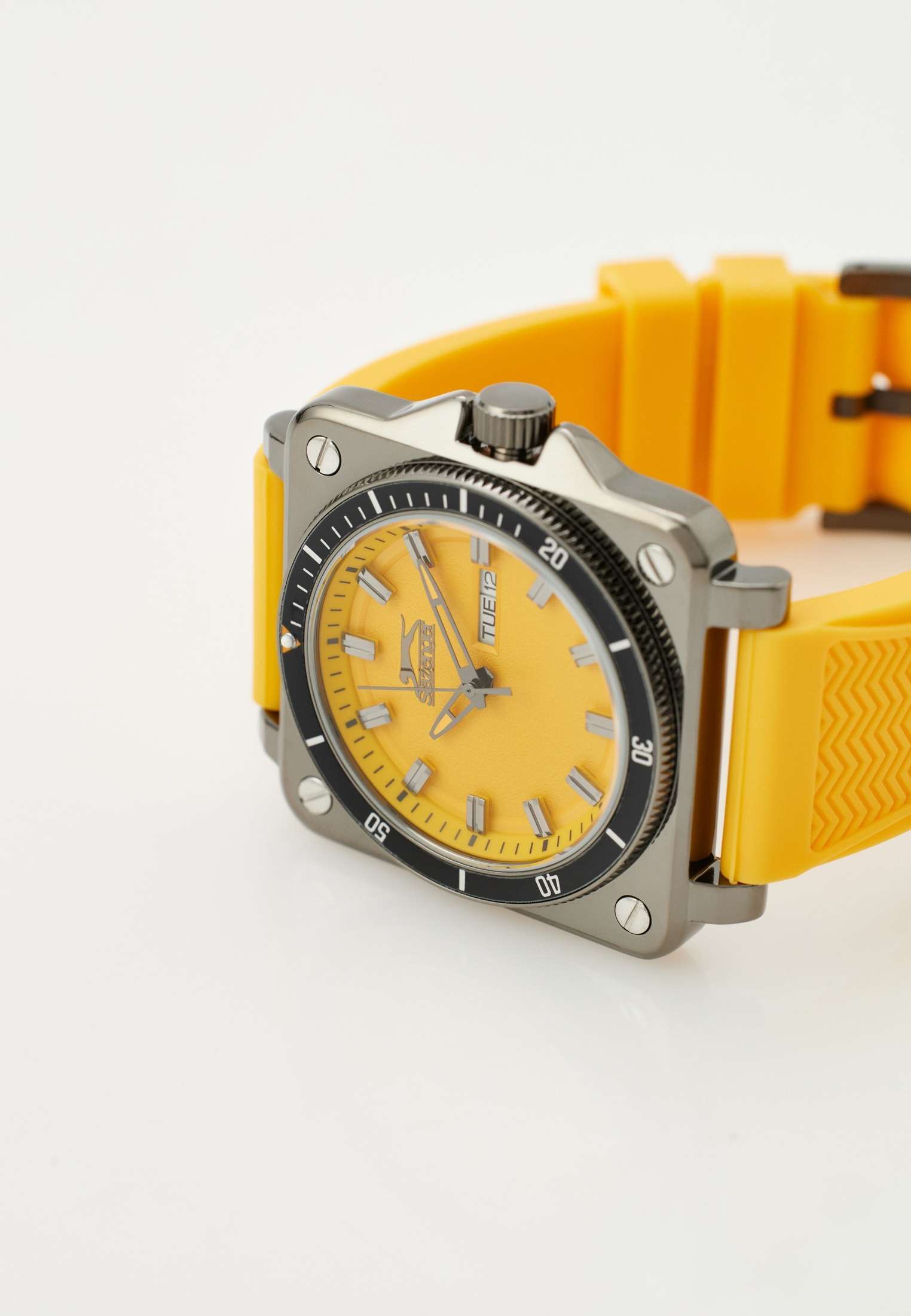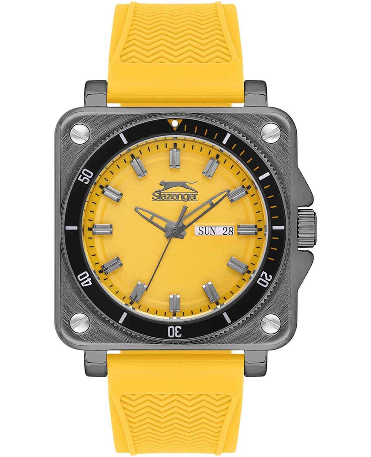 Часы Slazenger SL.09.2233.1.02 — это современная модель, сочетающая стиль и практичность. Корпус квадратной формы выполнен из прочного металла с серым IP-покрытиеIP-покрытиеМетод ионного напыления. Демонстрирует повышенную устойчивость к истиранию, окислению и химическим веществам. Под воздействием высокого давления и температуры около 1500°C молекулы металла надёжно соединяются с частицами корпуса часов., а круглый желтый циферблат придает дизайну особую выразительность. На вращающийся безельБезельВнешний ободок, закрепляющий стекло. В спортивных часах так называется поворотное кольцо с делениями на циферблате, выполняет роль таймера – замеряет отрезки времени на шкале. Неподвижный безель – элемент декора. Однонаправленно вращающийся безель на дайверских часах позволяет фиксировать моменты погружения и выныривания на поверхность. нанесено черное IP-покрытиеIP-покрытиеМетод ионного напыления. Демонстрирует повышенную устойчивость к истиранию, окислению и химическим веществам. Под воздействием высокого давления и температуры около 1500°C молекулы металла надёжно соединяются с частицами корпуса часов.. Резиновый желтый ремешок с классической застежкой обеспечивает удобство при повседневном ношении. Модель оснащена кварцевым механизмом, минеральное стеклоМинеральное стеклоМинеральное стекло представляет собой искусственно выращенный минерал кварца. Такое стекло отличается особой устойчивостью к повреждениям и царапинам. Уступает по некоторым качествам сапфировому стеклу., защищающим от случайных повреждений, и водозащитой уровня WR 50, позволяющей не бояться контакта с водой в повседневных ситуациях. На циферблате расположены окошки даты и дня недели. Для удобства использования в темное время суток предусмотрено люминесцентное покрытиеЛюминесцентное покрытиеПозволяет считывать показания времени в темноте. Производители наносят на стрелки, часовые индексы, безель или поверхность циферблата светонакопительный состав, дающий холодное свечение. стрелок. Заводная головка дополнительно защищена от случайных нажатий. Габариты корпуса составляют 43 на 43 мм, толщина — 11 мм.