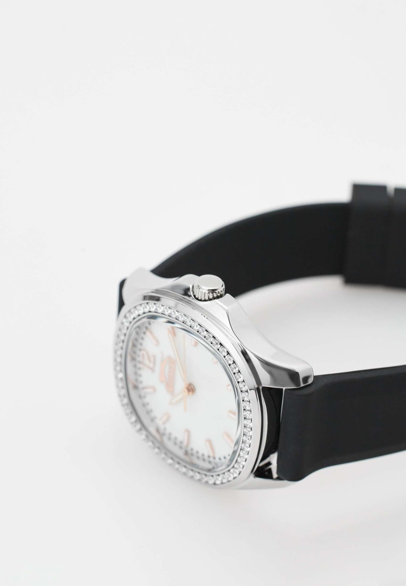 Часы Slazenger SL.09.2239.3.01 – это изысканный аксессуар, который станет стильным акцентом любого образа. Модель оснащена надежным кварцевым механизмом. Корпус из прочного металла размером 34х34 мм украшен россыпью сверкающих фианитов по безелюБезельВнешний ободок, закрепляющий стекло. В спортивных часах так называется поворотное кольцо с делениями на циферблате, выполняет роль таймера – замеряет отрезки времени на шкале. Неподвижный безель – элемент декора. Однонаправленно вращающийся безель на дайверских часах позволяет фиксировать моменты погружения и выныривания на поверхность., что придает часам особое сияние и элегантность. Белый перламутровый циферблат с логотипом бренда защищен стойким к царапинам минеральным стекломМинеральное стеклоМинеральное стекло представляет собой искусственно выращенный минерал кварца. Такое стекло отличается особой устойчивостью к повреждениям и царапинам. Уступает по некоторым качествам сапфировому стеклу.. Четкие часовые метки в виде лаконичных штрихов и крупная арабская цифра 12 обеспечивают удобство чтения времени. Заводная головка с рифлением дополнена защитой для повышения долговечности. Резиновый черный ремешок шириной 18 мм надежно фиксируется на запястье с помощью классической застежки. Для удобства использования в темное время суток предусмотрено люминесцентное покрытиеЛюминесцентное покрытиеПозволяет считывать показания времени в темноте. Производители наносят на стрелки, часовые индексы, безель или поверхность циферблата светонакопительный состав, дающий холодное свечение. стрелок. Водозащита 30WR позволяет не беспокоиться о случайных брызгах. Вес изделия составляет 43 грамма, что делает часы комфортными для ежедневного ношения. Эти часы идеально подойдут для тех, кто ценит гармонию стиля, качества и функциональности.