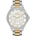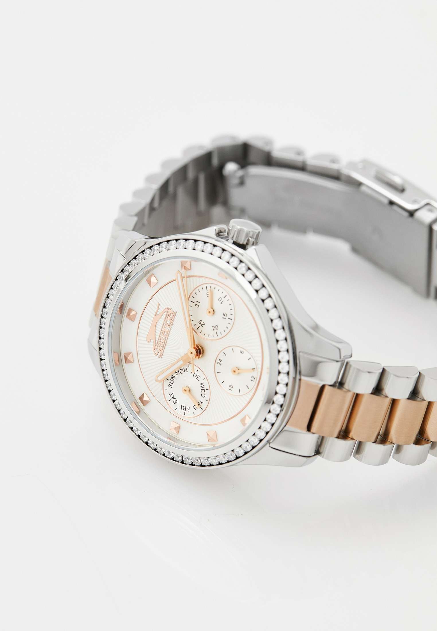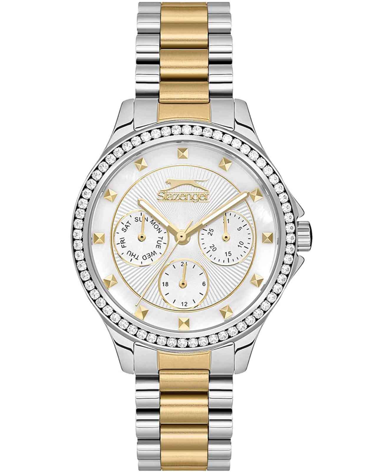 Эти женские часы Slazenger SL.09.2241.4.03 выполнены в современном стиле и станет элегантным дополнением к любому образу. Корпус и браслет изготовлены из прочного металла серебристого цвета, безельБезельВнешний ободок, закрепляющий стекло. В спортивных часах так называется поворотное кольцо с делениями на циферблате, выполняет роль таймера – замеряет отрезки времени на шкале. Неподвижный безель – элемент декора. Однонаправленно вращающийся безель на дайверских часах позволяет фиксировать моменты погружения и выныривания на поверхность. украшен изящными кристаллами, которые придают часам особую привлекательность. На циферблате расположены дополнительные малые циферблаты для отображения даты, дня недели и времени в 24-часовом формате, что делает их функциональными и удобными для ежедневного использования. Минеральное стеклоМинеральное стеклоМинеральное стекло представляет собой искусственно выращенный минерал кварца. Такое стекло отличается особой устойчивостью к повреждениям и царапинам. Уступает по некоторым качествам сапфировому стеклу. надежно защищает циферблат от царапин, а водозащита уровня WR 30 предохраняет механизм от случайных брызг воды. Заводная головка оснащена защитой, а стрелки имеют подсветку для легкого считывания времени в темноте. Диаметр корпуса составляет 34 мм, ширина браслета — 16 мм, толщина корпуса — 9 мм. Часы фиксируются на руке с помощью браслета из металла с частичным золотистым IP-покрытиемIP-покрытиеМетод ионного напыления. Демонстрирует повышенную устойчивость к истиранию, окислению и химическим веществам. Под воздействием высокого давления и температуры около 1500°C молекулы металла надёжно соединяются с частицами корпуса часов. удобной раскладной застёжкиРаскладная застёжкаТакой тип застёжки используется только на браслетах из металла. Она никогда не раскрывается полностью, происходит разделение на 2 и более частей. Раскладывающая застёжка снизит вероятность потери часов к минимуму.. Вес изделия подобран для комфортной ежедневной носки. Для удобства использования в темное время суток предусмотрено люминесцентное покрытиеЛюминесцентное покрытиеПозволяет считывать показания времени в темноте. Производители наносят на стрелки, часовые индексы, безель или поверхность циферблата светонакопительный состав, дающий холодное свечение. стрелок.
