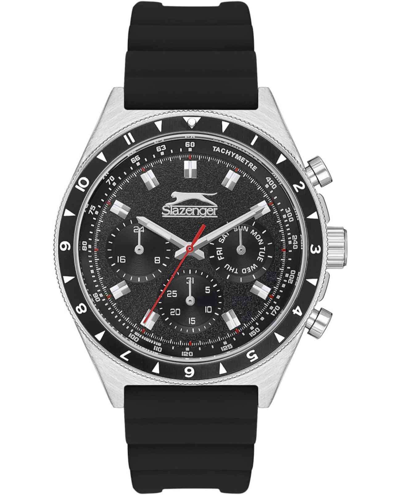 Часы Slazenger SL.09.2247.2.01 — это современная модель с выразительным спортивным характером, идеально подходящая для активного образа жизни. Корпус выполнен из прочного металла, черный циферблат защищён минеральным стекломМинеральное стеклоМинеральное стекло представляет собой искусственно выращенный минерал кварца. Такое стекло отличается особой устойчивостью к повреждениям и царапинам. Уступает по некоторым качествам сапфировому стеклу., устойчивым к царапинам. Часы также оснащены шкалой тахиметраТахиметрРазмеченная шкала, располагается на ободке или безеле часов. Тахиметр позволяет рассчитать скорость на определённом участке пути, расстояние измеряется в километрах или милях., что добавляет им функциональности и может быть полезно для измерения скорости. На безельБезельВнешний ободок, закрепляющий стекло. В спортивных часах так называется поворотное кольцо с делениями на циферблате, выполняет роль таймера – замеряет отрезки времени на шкале. Неподвижный безель – элемент декора. Однонаправленно вращающийся безель на дайверских часах позволяет фиксировать моменты погружения и выныривания на поверхность. нанесено черное IP-покрытиеIP-покрытиеМетод ионного напыления. Демонстрирует повышенную устойчивость к истиранию, окислению и химическим веществам. Под воздействием высокого давления и температуры около 1500°C молекулы металла надёжно соединяются с частицами корпуса часов.. Диаметр корпуса составляет 46 мм, толщина — 11 мм, а ширина ремешка — 22 мм. Лёгкий и комфортный чёрный резиновый ремешок оснащён классической застёжкой, благодаря чему часы удобно сидят на руке и не вызывают дискомфорта даже при длительном ношении. Вес модели составляет всего 79 грамм. Надёжный кварцевый механизм обеспечивает точность времени, а уровень водозащиты WR 50 позволяет использовать часы в повседневных условиях, не опасаясь случайных брызг или дождя. Для удобства использования в темное время суток предусмотрено люминесцентное покрытиеЛюминесцентное покрытиеПозволяет считывать показания времени в темноте. Производители наносят на стрелки, часовые индексы, безель или поверхность циферблата светонакопительный состав, дающий холодное свечение. стрелок и меток. Дополнительные малые циферблаты показывают дату, день недели и текущее время в 24-часовом формате, что делает использование часов ещё более удобным и функциональным.