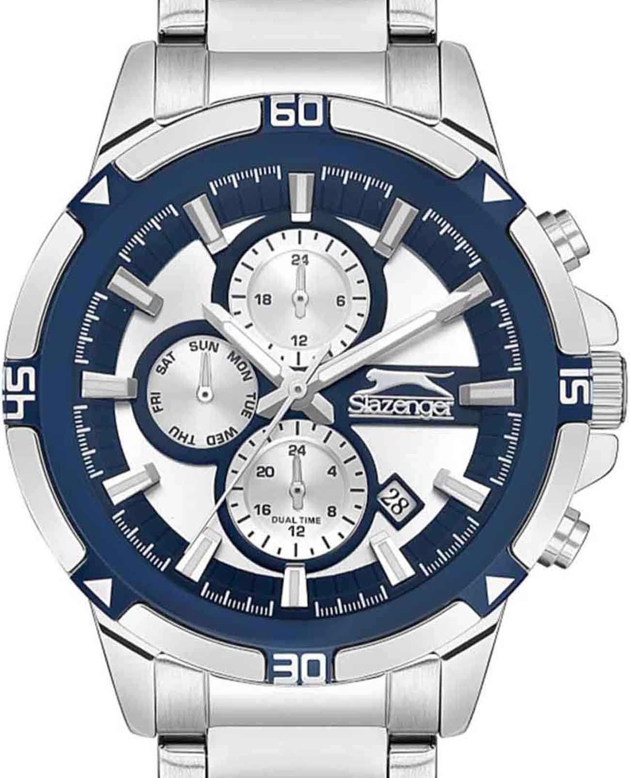 Часы Slazenger SL.09.2249.2.02 — это стильная и практичная модель, выполненная в элегантном серебристом цвете. Корпус и браслет изготовлены из металла, что обеспечивает прочность и долговечность. На безельБезельВнешний ободок, закрепляющий стекло. В спортивных часах так называется поворотное кольцо с делениями на циферблате, выполняет роль таймера – замеряет отрезки времени на шкале. Неподвижный безель – элемент декора. Однонаправленно вращающийся безель на дайверских часах позволяет фиксировать моменты погружения и выныривания на поверхность. частично нанесено синее IP-покрытиеIP-покрытиеМетод ионного напыления. Демонстрирует повышенную устойчивость к истиранию, окислению и химическим веществам. Под воздействием высокого давления и температуры около 1500°C молекулы металла надёжно соединяются с частицами корпуса часов.. Минеральное стеклоМинеральное стеклоМинеральное стекло представляет собой искусственно выращенный минерал кварца. Такое стекло отличается особой устойчивостью к повреждениям и царапинам. Уступает по некоторым качествам сапфировому стеклу. надежно защищает сине-серебристый циферблат от царапин и повреждений. Диаметр корпуса составляет 45 мм, а толщина — 12 мм, благодаря чему часы смотрятся солидно и современно. Модель оснащена кварцевым механизмом, отличающимся точностью и надежностью. На циферблате представлены дополнительные малые циферблаты для отображения второго часового поясаВторой часовой поясФункция, позволяющая отображать время двух часовых поясов одновременно., дня недели и времени в 24-часовом формате, а также имеется отдельное окошко даты. Для удобства использования в темное время суток предусмотрено люминесцентное покрытиеЛюминесцентное покрытиеПозволяет считывать показания времени в темноте. Производители наносят на стрелки, часовые индексы, безель или поверхность циферблата светонакопительный состав, дающий холодное свечение. стрелок и меток. Удобный металлический браслет шириной 22 мм снабжен раскладной застёжкойРаскладная застёжкаТакой тип застёжки используется только на браслетах из металла. Она никогда не раскрывается полностью, происходит разделение на 2 и более частей. Раскладывающая застёжка снизит вероятность потери часов к минимуму., обеспечивающей надежную фиксацию на запястье. Заводная головка оснащена защитой. Водозащита уровня WR 50 позволяет не снимать часы при мытье рук или попадании под дождь. Вес модели составляет 151 грамм.