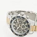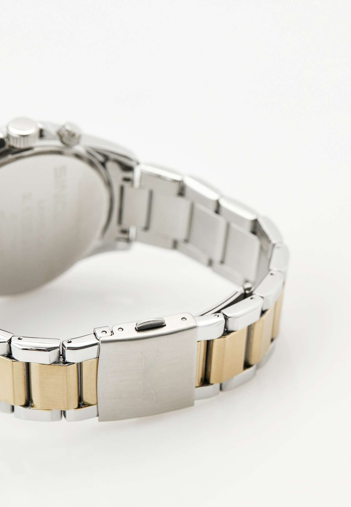 Часы Slazenger SL.09.2250.2.05 — это стильная и практичная модель, выполненная в элегантном серебристом цвете. Корпус изготовлен из металла, а на металлический браслет нанесено частичное золотистое IP-покрытиеIP-покрытиеМетод ионного напыления. Демонстрирует повышенную устойчивость к истиранию, окислению и химическим веществам. Под воздействием высокого давления и температуры около 1500°C молекулы металла надёжно соединяются с частицами корпуса часов., что обеспечивает прочность и долговечность. На безельБезельВнешний ободок, закрепляющий стекло. В спортивных часах так называется поворотное кольцо с делениями на циферблате, выполняет роль таймера – замеряет отрезки времени на шкале. Неподвижный безель – элемент декора. Однонаправленно вращающийся безель на дайверских часах позволяет фиксировать моменты погружения и выныривания на поверхность. нанесено черное IP-покрытиеIP-покрытиеМетод ионного напыления. Демонстрирует повышенную устойчивость к истиранию, окислению и химическим веществам. Под воздействием высокого давления и температуры около 1500°C молекулы металла надёжно соединяются с частицами корпуса часов.. Минеральное стеклоМинеральное стеклоМинеральное стекло представляет собой искусственно выращенный минерал кварца. Такое стекло отличается особой устойчивостью к повреждениям и царапинам. Уступает по некоторым качествам сапфировому стеклу. надежно защищает синий циферблат от царапин и повреждений. Диаметр корпуса составляет 44 мм, а толщина — 11 мм, благодаря чему часы смотрятся солидно и современно. Модель оснащена кварцевым механизмом, отличающимся точностью и надежностью. На циферблате представлены дополнительные малые циферблаты для отображения второго часового поясаВторой часовой поясФункция, позволяющая отображать время двух часовых поясов одновременно., дня недели и времени в 24-часовом формате, а также имеется отдельное окошко даты. Для удобства использования в темное время суток предусмотрено люминесцентное покрытиеЛюминесцентное покрытиеПозволяет считывать показания времени в темноте. Производители наносят на стрелки, часовые индексы, безель или поверхность циферблата светонакопительный состав, дающий холодное свечение. стрелок и меток. Удобный металлический браслет шириной 22 мм снабжен раскладной застёжкойРаскладная застёжкаТакой тип застёжки используется только на браслетах из металла. Она никогда не раскрывается полностью, происходит разделение на 2 и более частей. Раскладывающая застёжка снизит вероятность потери часов к минимуму., обеспечивающей надежную фиксацию на запястье. Заводная головка оснащена защитой. Водозащита уровня WR 50 позволяет не снимать часы при мытье рук или попадании под дождь. Вес модели составляет 152 грамм.