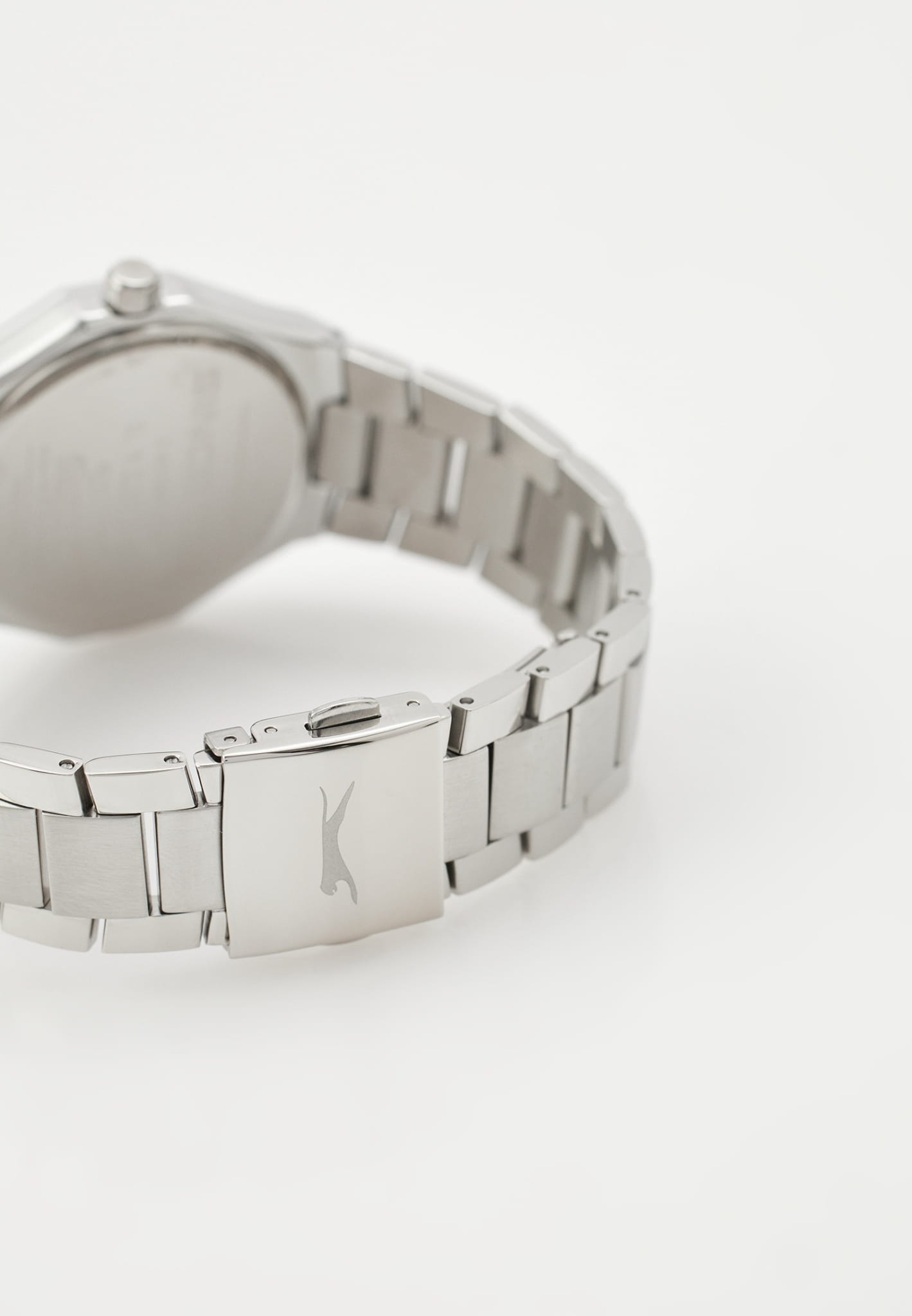 Часы Slazenger SL.09.2258.3.01 — это изысканный аксессуар, который гармонично подчеркнёт ваш индивидуальный стиль. Корпус и браслет выполнены из инновационного суперметалла — сплава на основе меди с пониженным содержанием цинка и никеля, обладающего специальным защитным покрытием, а циферблат украшен 4 кристаллами. Надёжный кварцевый механизм обеспечивает точный ход, а прочное минеральное стеклоМинеральное стеклоМинеральное стекло представляет собой искусственно выращенный минерал кварца. Такое стекло отличается особой устойчивостью к повреждениям и царапинам. Уступает по некоторым качествам сапфировому стеклу. устойчиво к царапинам и защищает серебристый циферблат от внешних воздействий. Диаметр корпуса составляет 38 мм, толщина — всего 8 мм, что делает модель элегантной и удобной для ежедневного ношения. Водонепроницаемость до 3 бар позволяет не беспокоиться о случайных брызгах или каплях дождя. Стрелки с люминесцентным покрытиемЛюминесцентное покрытиеПозволяет считывать показания времени в темноте. Производители наносят на стрелки, часовые индексы, безель или поверхность циферблата светонакопительный состав, дающий холодное свечение. удобно подсвечиваются в темноте после зарядки на свету. Стальной браслет с раскладной застёжкойРаскладная застёжкаТакой тип застёжки используется только на браслетах из металла. Она никогда не раскрывается полностью, происходит разделение на 2 и более частей. Раскладывающая застёжка снизит вероятность потери часов к минимуму. обеспечивает комфортную посадку. Часы станут отличным выбором как для повседневной жизни, так и для особых случаев, а также послужат прекрасным подарком на любой праздник.