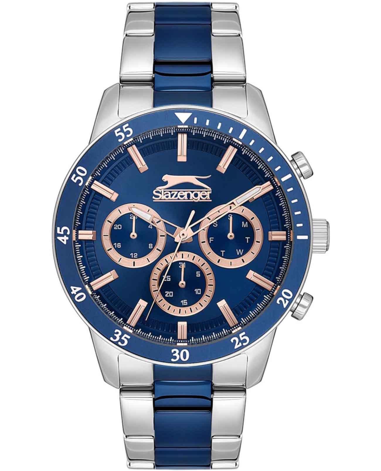 Часы Slazenger SL.09.2260.2.06 сочетают в себе выразительный дизайн и практичность, делая их отличным выбором для современного мужчины. Корпус и браслет выполнены из суперметалла — прочного сплава на основе меди с низким содержанием цинка и никеля, что обеспечивает долговечность изделия. На безельБезельВнешний ободок, закрепляющий стекло. В спортивных часах так называется поворотное кольцо с делениями на циферблате, выполняет роль таймера – замеряет отрезки времени на шкале. Неподвижный безель – элемент декора. Однонаправленно вращающийся безель на дайверских часах позволяет фиксировать моменты погружения и выныривания на поверхность. нанесено синее IP-покрытиеIP-покрытиеМетод ионного напыления. Демонстрирует повышенную устойчивость к истиранию, окислению и химическим веществам. Под воздействием высокого давления и температуры около 1500°C молекулы металла надёжно соединяются с частицами корпуса часов., что придает аксессуару утончённый и универсальный внешний вид. Модель оснащена точным кварцевым механизмом, защищённым минеральным стекломМинеральное стеклоМинеральное стекло представляет собой искусственно выращенный минерал кварца. Такое стекло отличается особой устойчивостью к повреждениям и царапинам. Уступает по некоторым качествам сапфировому стеклу.. На синем циферблате размещены дополнительные индикаторы: 24-часовой формат времени, дата и день недели. Класс водозащиты 5 бар позволяет не беспокоиться о брызгах и дожде. Диаметр корпуса составляет 45 мм, толщина — 12 мм, что придаёт часам солидный и современный вид. Стрелки с люминесцентным покрытиемЛюминесцентное покрытиеПозволяет считывать показания времени в темноте. Производители наносят на стрелки, часовые индексы, безель или поверхность циферблата светонакопительный состав, дающий холодное свечение. удобно подсвечиваются в темноте после зарядки на свету. Стальной браслет с синим IP-покрытиемIP-покрытиеМетод ионного напыления. Демонстрирует повышенную устойчивость к истиранию, окислению и химическим веществам. Под воздействием высокого давления и температуры около 1500°C молекулы металла надёжно соединяются с частицами корпуса часов. с раскладной застёжкойРаскладная застёжкаТакой тип застёжки используется только на браслетах из металла. Она никогда не раскрывается полностью, происходит разделение на 2 и более частей. Раскладывающая застёжка снизит вероятность потери часов к минимуму. обеспечивает комфортную посадку. Модель станет надёжным спутником как на каждый день, так и для особых случаев, а также превосходно подойдёт в качестве подарка. Гарантия от производителя — 12 месяцев.
