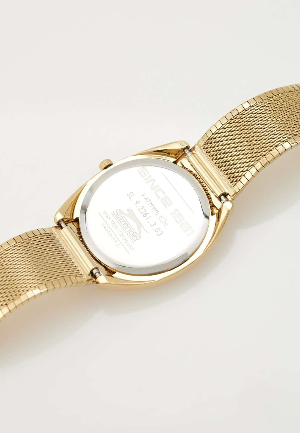 Часы Slazenger SL.09.2261.3.03 — это утонченное сочетание современного дизайна и классической элегантности. Изделие оснащено надежным кварцевым механизмом, который обеспечивает точность хода и простоту эксплуатации. Корпус из суперметалла с золотистым IP-покрытиемIP-покрытиеМетод ионного напыления. Демонстрирует повышенную устойчивость к истиранию, окислению и химическим веществам. Под воздействием высокого давления и температуры около 1500°C молекулы металла надёжно соединяются с частицами корпуса часов. гармонично сочетается с металлическим браслетом аналогичного оттенка и покрытия, подчеркивая изысканность аксессуара и его актуальность в модных тенденциях. Золотистый циферблат украшен изысканным гильоше Clous de Paris и дополнен лаконичными метками в виде штрихов, а также фирменным логотипом бренда. Минеральное стеклоМинеральное стеклоМинеральное стекло представляет собой искусственно выращенный минерал кварца. Такое стекло отличается особой устойчивостью к повреждениям и царапинам. Уступает по некоторым качествам сапфировому стеклу. надежно защищает циферблат от случайных царапин. Диаметр корпуса составляет 34 мм, толщина — 8 мм, ширина браслета — 18 мм, а вес часов — всего 54 г, благодаря чему аксессуар удобно сидит на запястье. Стальной браслет c раскладным замкомРаскладной замокДанный вариант застежки используется только на часах с металлическим браслетом. Отличительная особенность такого крепления в том, что длина браслета становится универсальной и вы можете самостоятельно отрегулировать нужный вам размер – застежка просто двигается по браслету часов. удобно фиксируется на запястье и подчёркивает современный характер часов. Водозащита 30WR позволяет не беспокоиться о случайных брызгах. Модель отличается отсутствием секундной стрелки и оснащена рифленой заводной головкой для легкой корректировки времени. Эти часы станут стильным завершением любого образа, подчеркивая индивидуальность и чувство вкуса обладателя.