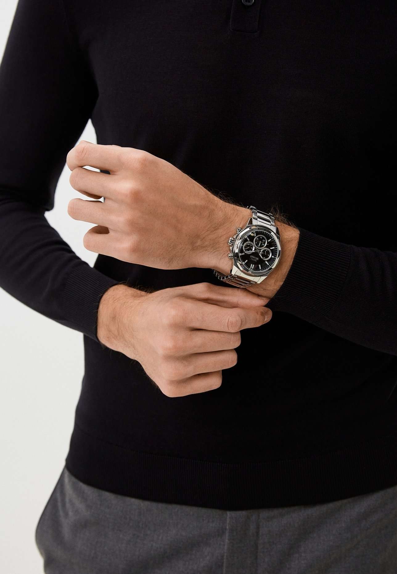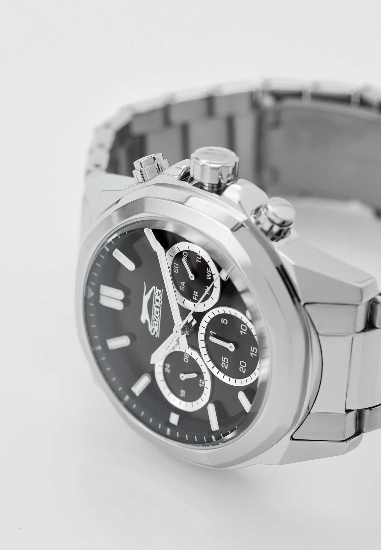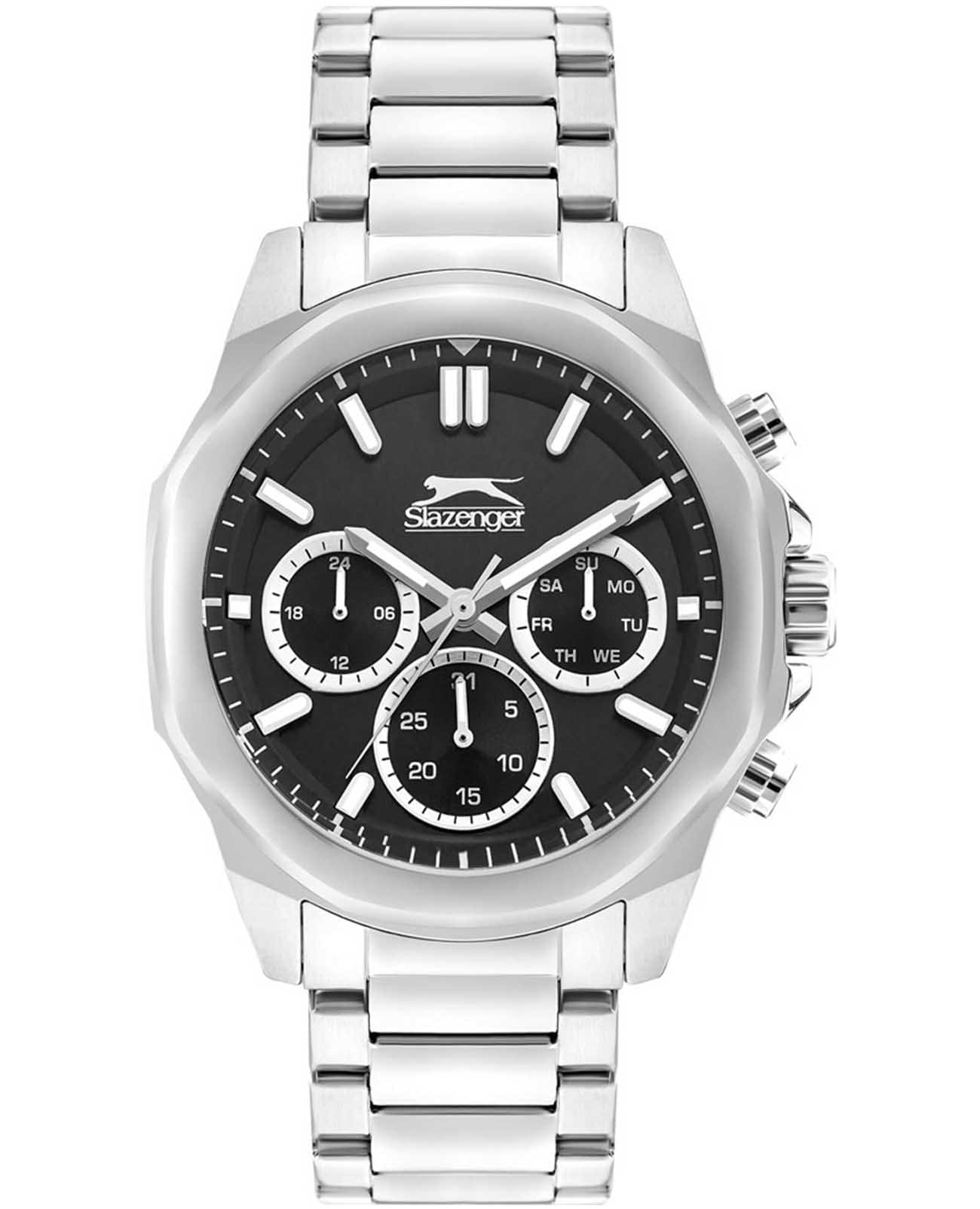 Часы Slazenger SL.09.2289.2.01 — это сочетание современного дизайна и функциональности, идеально подходящее для тех, кто ценит стиль и надежность. Корпус и браслет выполнены из прочного суперметалла, что придаёт модели солидный и эффектный вид. Черный циферблат с лаконичными отметками и фирменным логотипом защищён устойчивым к царапинам минеральным стекломМинеральное стеклоМинеральное стекло представляет собой искусственно выращенный минерал кварца. Такое стекло отличается особой устойчивостью к повреждениям и царапинам. Уступает по некоторым качествам сапфировому стеклу.. Дополнительные функции включают отображение даты и дня недели, а также 12- и 24-часовой формат времени на отдельных мини-циферблатах, что делает использование часов максимально удобным. Заводная головка оснащена защитой, а надёжная раскладная застёжкаРаскладная застёжкаТакой тип застёжки используется только на браслетах из металла. Она никогда не раскрывается полностью, происходит разделение на 2 и более частей. Раскладывающая застёжка снизит вероятность потери часов к минимуму. обеспечивает комфортную посадку на запястье. Особое внимание привлекает восьмигранный безельБезельВнешний ободок, закрепляющий стекло. В спортивных часах так называется поворотное кольцо с делениями на циферблате, выполняет роль таймера – замеряет отрезки времени на шкале. Неподвижный безель – элемент декора. Однонаправленно вращающийся безель на дайверских часах позволяет фиксировать моменты погружения и выныривания на поверхность.. Циферблат оснащён люминесцентным покрытиемЛюминесцентное покрытиеПозволяет считывать показания времени в темноте. Производители наносят на стрелки, часовые индексы, безель или поверхность циферблата светонакопительный состав, дающий холодное свечение. стрелок и меток, что позволяет легко определять время даже в условиях плохой освещенности. Водозащита 50WR позволяет не беспокоиться о случайных брызгах и дождевых каплях. Диаметр корпуса составляет 46 мм, толщина — 14 мм, вес — 165 г, благодаря чему часы выглядят внушительно и подчёркивают индивидуальный стиль владельца. Эта модель станет отличным акцентом в вашем образе и подчеркнёт вашу уверенность в любой ситуации.
