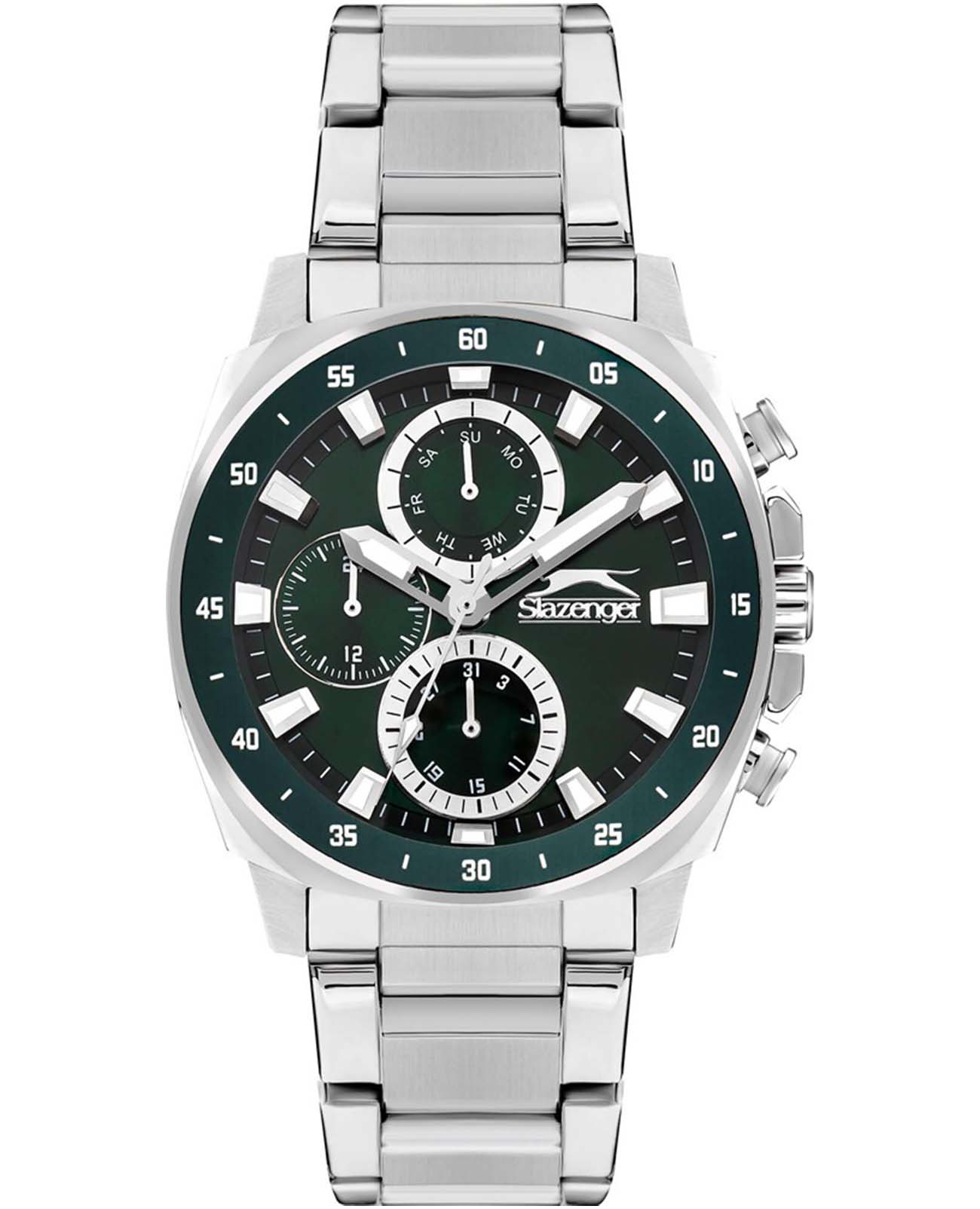 Slazenger SL.09.2292.2.03 — это стильные наручные часы, выполненные в современном дизайне и отлично подходящие для повседневного использования. Корпус диаметром 45 мм изготовлен из прочного металла и дополнен минеральным стекломМинеральное стеклоМинеральное стекло представляет собой искусственно выращенный минерал кварца. Такое стекло отличается особой устойчивостью к повреждениям и царапинам. Уступает по некоторым качествам сапфировому стеклу., которое защищает зеленый циферблат. Серебристый металлический браслет шириной 24 мм оснащён надежной раскладной застёжкойРаскладная застёжкаТакой тип застёжки используется только на браслетах из металла. Она никогда не раскрывается полностью, происходит разделение на 2 и более частей. Раскладывающая застёжка снизит вероятность потери часов к минимуму., которая обеспечивает комфортную посадку на руке. Кварцевый механизм гарантирует точный ход, а водозащита уровня WR 50 позволяет не снимать часы во время мытья рук или под дождём. Модель оснащена люминесцентным покрытиемЛюминесцентное покрытиеПозволяет считывать показания времени в темноте. Производители наносят на стрелки, часовые индексы, безель или поверхность циферблата светонакопительный состав, дающий холодное свечение. стрелок и меток, что облегчает считывание времени в темноте. Дополнительные малые циферблаты отображают дату, день недели и текущее время в 24-часовом формате. Часы также оснащены заводной головкой с защитой и безелемБезельВнешний ободок, закрепляющий стекло. В спортивных часах так называется поворотное кольцо с делениями на циферблате, выполняет роль таймера – замеряет отрезки времени на шкале. Неподвижный безель – элемент декора. Однонаправленно вращающийся безель на дайверских часах позволяет фиксировать моменты погружения и выныривания на поверхность. с зеленым IP-покрытиемIP-покрытиеМетод ионного напыления. Демонстрирует повышенную устойчивость к истиранию, окислению и химическим веществам. Под воздействием высокого давления и температуры около 1500°C молекулы металла надёжно соединяются с частицами корпуса часов. и секундной разметкой. Вес изделия составляет 173 грамма.