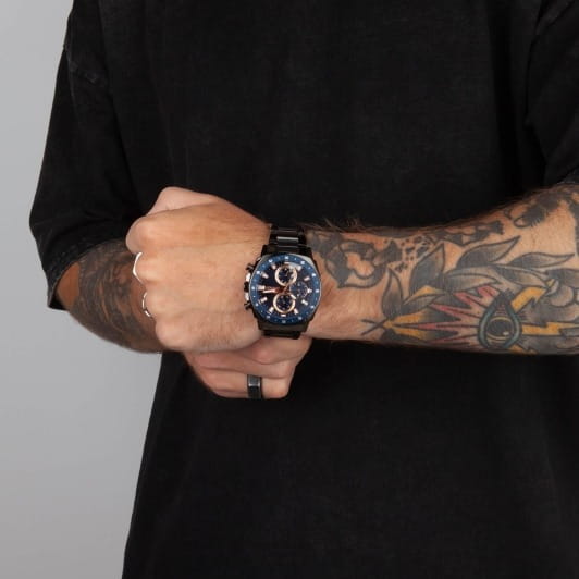 Slazenger SL.09.2292.2.04 — это стильные наручные часы, выполненные в современном дизайне и отлично подходящие для повседневного использования. Корпус диаметром 45 мм изготовлен из прочного металла с черным IP-покрытиемIP-покрытиеМетод ионного напыления. Демонстрирует повышенную устойчивость к истиранию, окислению и химическим веществам. Под воздействием высокого давления и температуры около 1500°C молекулы металла надёжно соединяются с частицами корпуса часов. и дополнен минеральным стекломМинеральное стеклоМинеральное стекло представляет собой искусственно выращенный минерал кварца. Такое стекло отличается особой устойчивостью к повреждениям и царапинам. Уступает по некоторым качествам сапфировому стеклу., которое защищает синий циферблат. Черный металлический браслет с IP-покрытиемIP-покрытиеМетод ионного напыления. Демонстрирует повышенную устойчивость к истиранию, окислению и химическим веществам. Под воздействием высокого давления и температуры около 1500°C молекулы металла надёжно соединяются с частицами корпуса часов. шириной 24 мм оснащён надежной раскладной застёжкойРаскладная застёжкаТакой тип застёжки используется только на браслетах из металла. Она никогда не раскрывается полностью, происходит разделение на 2 и более частей. Раскладывающая застёжка снизит вероятность потери часов к минимуму., которая обеспечивает комфортную посадку на руке. Кварцевый механизм гарантирует точный ход, а водозащита уровня WR 50 позволяет не снимать часы во время мытья рук или под дождём. Модель оснащена люминесцентным покрытиемЛюминесцентное покрытиеПозволяет считывать показания времени в темноте. Производители наносят на стрелки, часовые индексы, безель или поверхность циферблата светонакопительный состав, дающий холодное свечение. стрелок и меток, что облегчает считывание времени в темноте. Дополнительные малые циферблаты отображают дату, день недели и текущее время в 24-часовом формате. Часы также оснащены заводной головкой с защитой и безелемБезельВнешний ободок, закрепляющий стекло. В спортивных часах так называется поворотное кольцо с делениями на циферблате, выполняет роль таймера – замеряет отрезки времени на шкале. Неподвижный безель – элемент декора. Однонаправленно вращающийся безель на дайверских часах позволяет фиксировать моменты погружения и выныривания на поверхность. с синим IP-покрытиемIP-покрытиеМетод ионного напыления. Демонстрирует повышенную устойчивость к истиранию, окислению и химическим веществам. Под воздействием высокого давления и температуры около 1500°C молекулы металла надёжно соединяются с частицами корпуса часов. и секундной разметкой. Вес изделия составляет 173 грамма.