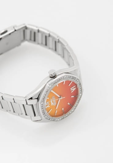 Женские кварцевые часы Slazenger SL.09.2301.3.07 — это элегантный и изысканный аксессуар, подчеркивающий стиль и утончённость. Корпус и браслет выполнены из суперметалла, защищён минеральным стекломМинеральное стеклоМинеральное стекло представляет собой искусственно выращенный минерал кварца. Такое стекло отличается особой устойчивостью к повреждениям и царапинам. Уступает по некоторым качествам сапфировому стеклу.. Циферблат с рельефным рисунком оформлен штриховыми метками и римскими цифрами VI и XII, дополнен логотипом бренда. Безель гранёный, украшен паве из фианитов, придающих модели изысканное сияние. Заводная головка — граненая, добавляющая детали дизайна. Браслет из суперметалла фиксируется на раскладной застёжкеРаскладная застёжкаТакой тип застёжки используется только на браслетах из металла. Она никогда не раскрывается полностью, происходит разделение на 2 и более частей. Раскладывающая застёжка снизит вероятность потери часов к минимуму., обеспечивая надёжность и комфорт ношения. Водонепроницаемость 30 м позволяет использовать часы в повседневных условиях, защищая от случайных брызг и капель дождя. Модель идеально подходит как для повседневного, так и для торжественного образа.