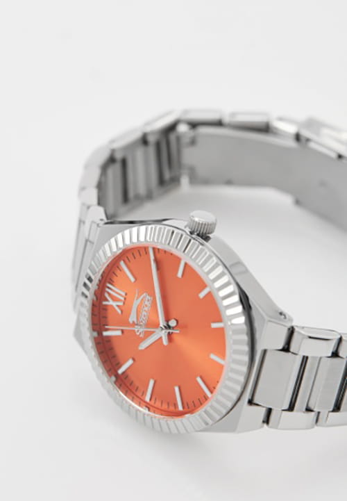 Женские кварцевые часы Slazenger SL.09.2304.3.01 — это элегантный и стильный аксессуар, идеально дополняющий любой образ. Корпус и браслет выполнены из суперметалла, защищён минеральным стекломМинеральное стеклоМинеральное стекло представляет собой искусственно выращенный минерал кварца. Такое стекло отличается особой устойчивостью к повреждениям и царапинам. Уступает по некоторым качествам сапфировому стеклу.. Циферблат оранжевого цвета оформлен в классическом стиле, стрелки оснащены люминесцентным покрытиемЛюминесцентное покрытиеПозволяет считывать показания времени в темноте. Производители наносят на стрелки, часовые индексы, безель или поверхность циферблата светонакопительный состав, дающий холодное свечение., обеспечивающим хорошую читаемость в темноте. Браслет из суперметалла фиксируется на раскладной застёжкеРаскладная застёжкаТакой тип застёжки используется только на браслетах из металла. Она никогда не раскрывается полностью, происходит разделение на 2 и более частей. Раскладывающая застёжка снизит вероятность потери часов к минимуму., обеспечивая надёжность и комфорт ношения. Водонепроницаемость 30 м позволяет использовать часы в повседневных условиях, защищая от случайных брызг и капель дождя. Модель сочетает в себе лёгкость, прочность и изысканный внешний вид.