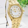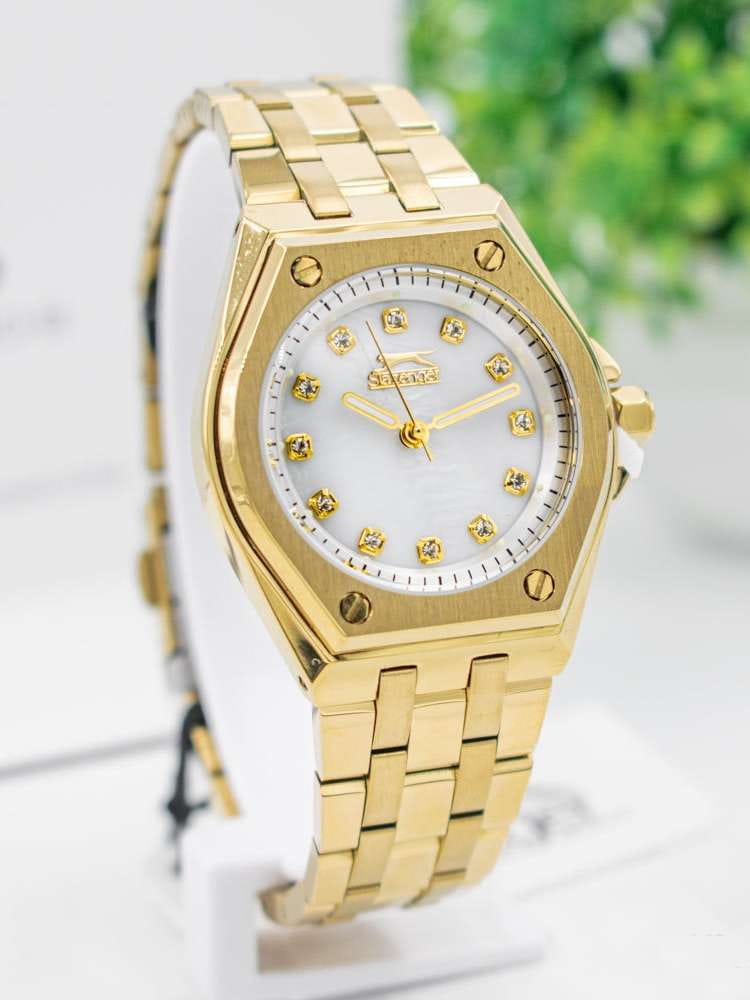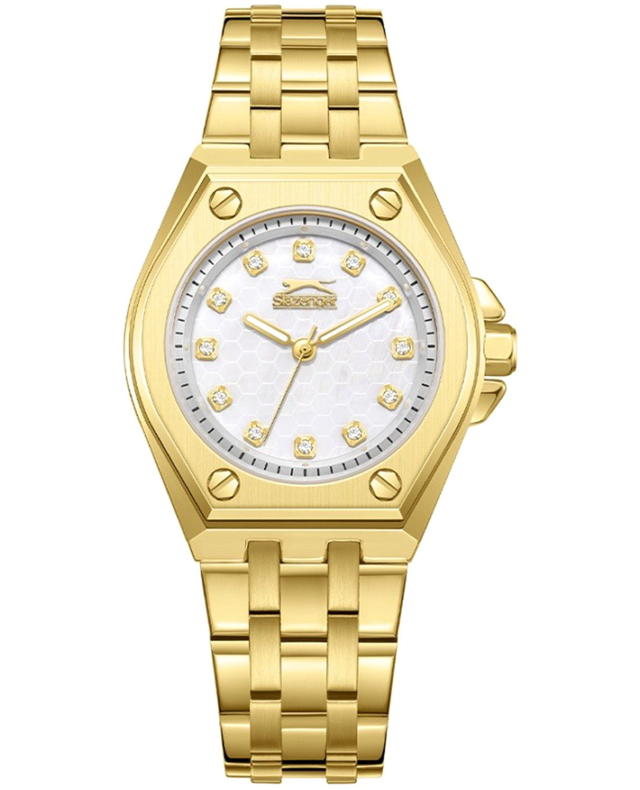 Женские кварцевые часы Slazenger SL.09.2342.3.06 – это сочетание элегантности, современного стиля и надёжности. Изящный корпус из суперметалла с IP-покрытиемIP-покрытиеМетод ионного напыления. Демонстрирует повышенную устойчивость к истиранию, окислению и химическим веществам. Под воздействием высокого давления и температуры около 1500°C молекулы металла надёжно соединяются с частицами корпуса часов. золотистого цвета, диаметром 34 мм и толщиной 9 мм, подчёркивает утончённость модели и делает их идеальным аксессуаром для любой ситуации – будь то деловая встреча, романтический вечер или повседневные выходы. Циферблат надёжно защищён минеральным стекломМинеральное стеклоМинеральное стекло представляет собой искусственно выращенный минерал кварца. Такое стекло отличается особой устойчивостью к повреждениям и царапинам. Уступает по некоторым качествам сапфировому стеклу., которое устойчиво к механическим повреждениям и сохраняет кристальную прозрачность и украшен фианитами. Стрелки с люминесцентным покрытиемЛюминесцентное покрытиеПозволяет считывать показания времени в темноте. Производители наносят на стрелки, часовые индексы, безель или поверхность циферблата светонакопительный состав, дающий холодное свечение. мягко подсвечиваются в темноте, обеспечивая комфортное считывание времени в любое время суток. Браслет из суперметалла с IP-покрытиемIP-покрытиеМетод ионного напыления. Демонстрирует повышенную устойчивость к истиранию, окислению и химическим веществам. Под воздействием высокого давления и температуры около 1500°C молекулы металла надёжно соединяются с частицами корпуса часов. удобно облегает запястье и фиксируется с помощью раскладной застёжкиРаскладная застёжкаТакой тип застёжки используется только на браслетах из металла. Она никогда не раскрывается полностью, происходит разделение на 2 и более частей. Раскладывающая застёжка снизит вероятность потери часов к минимуму., обеспечивая надёжность и комфорт в повседневном ношении. Утончённый стиль, внимание к деталям и практичность делают эту модель идеальным выбором для современных женщин, ценящих эстетику и функциональность. Водозащита до 30 метров позволит защитить корпус от случайных брызг или капель дождя.