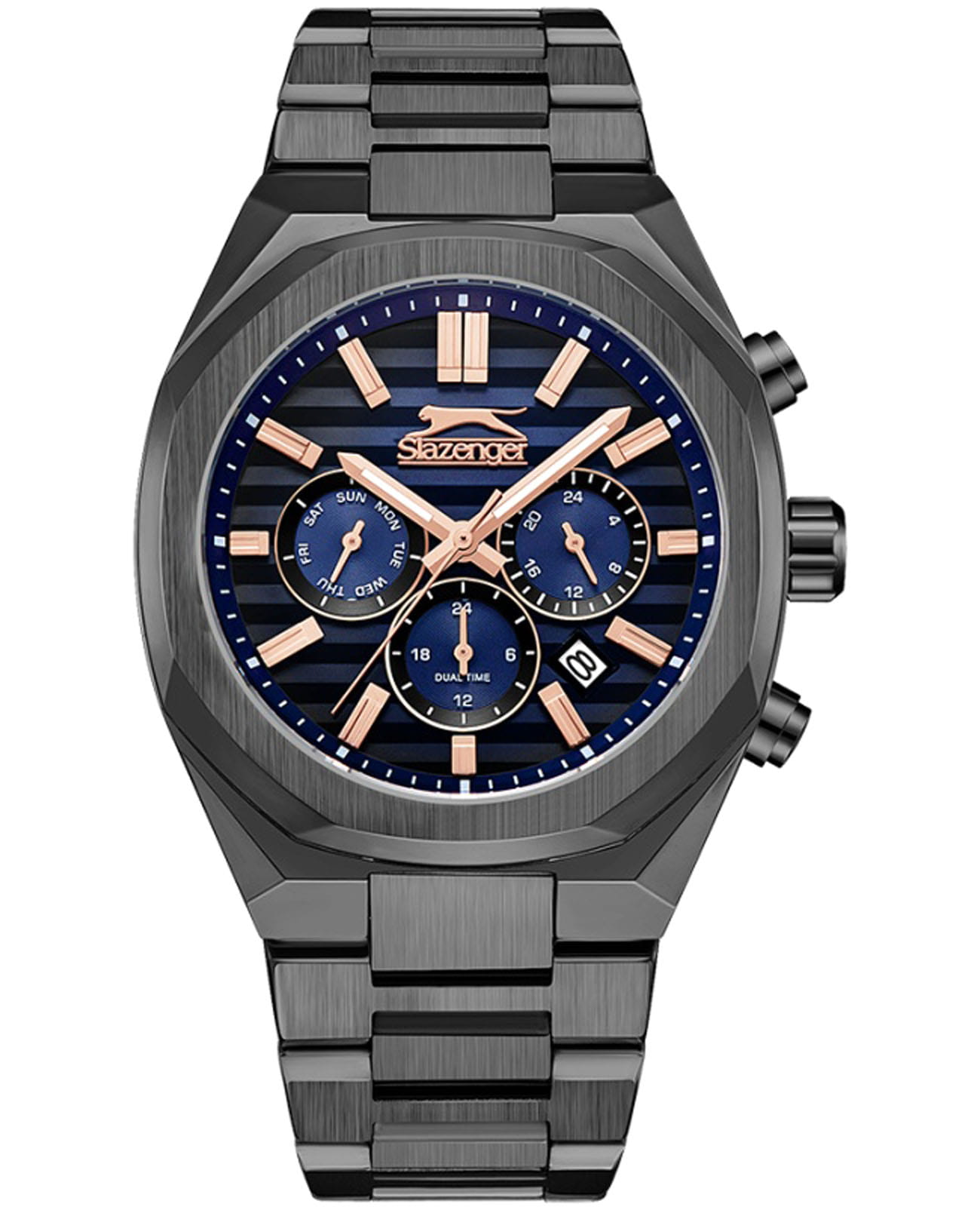 Мужские кварцевые часы Slazenger SL.09.2345.2.04 – идеальное сочетание классического дизайна и современных технологий, созданное для уверенных в себе мужчин. Корпус выполнен из суперметалла с IP-покрытиемIP-покрытиеМетод ионного напыления. Демонстрирует повышенную устойчивость к истиранию, окислению и химическим веществам. Под воздействием высокого давления и температуры около 1500°C молекулы металла надёжно соединяются с частицами корпуса часов. черного цвета, диаметром 43 мм и толщиной 12 мм, подчёркивает надежность модели и делает их идеальным аксессуаром для любой ситуации – будь то деловая встреча или повседневные выходы. Циферблат надёжно защищён минеральным стекломМинеральное стеклоМинеральное стекло представляет собой искусственно выращенный минерал кварца. Такое стекло отличается особой устойчивостью к повреждениям и царапинам. Уступает по некоторым качествам сапфировому стеклу., которое устойчиво к механическим повреждениям и сохраняет кристальную прозрачность. Браслет из суперметалла с IP-покрытиемIP-покрытиеМетод ионного напыления. Демонстрирует повышенную устойчивость к истиранию, окислению и химическим веществам. Под воздействием высокого давления и температуры около 1500°C молекулы металла надёжно соединяются с частицами корпуса часов. удобно облегает запястье и фиксируется с помощью раскладной застёжкиРаскладная застёжкаТакой тип застёжки используется только на браслетах из металла. Она никогда не раскрывается полностью, происходит разделение на 2 и более частей. Раскладывающая застёжка снизит вероятность потери часов к минимуму., обеспечивая надёжность и комфорт в повседневном ношении. Стрелки и метки покрыты люминесцентным покрытиемЛюминесцентное покрытиеПозволяет считывать показания времени в темноте. Производители наносят на стрелки, часовые индексы, безель или поверхность циферблата светонакопительный состав, дающий холодное свечение., обеспечивающим отличную читаемость в темноте. Эти часы станут не просто аксессуаром, а надежным спутником в любой ситуации, подчеркивая ваш безупречный вкус и деловой стиль. Окошко даты находится в положении между 4 и 5 часов. Вынесенный циферблат с 24-х часовым указателем времени. Водозащита до 50 метров позволит защитить корпус от случайных брызг или капель дождя. Функция GMTGMTОтображение времени второго часового пояса.Такая функция особенно актуальна для путешественников и бизнесменов,которые общаются с людьми из разных стран,теперь вы всегда будете знать,какой час у вашего партнёра или близкого человека. поможет отслеживать время второго часового поясаВторой часовой поясФункция, позволяющая отображать время двух часовых поясов одновременно..