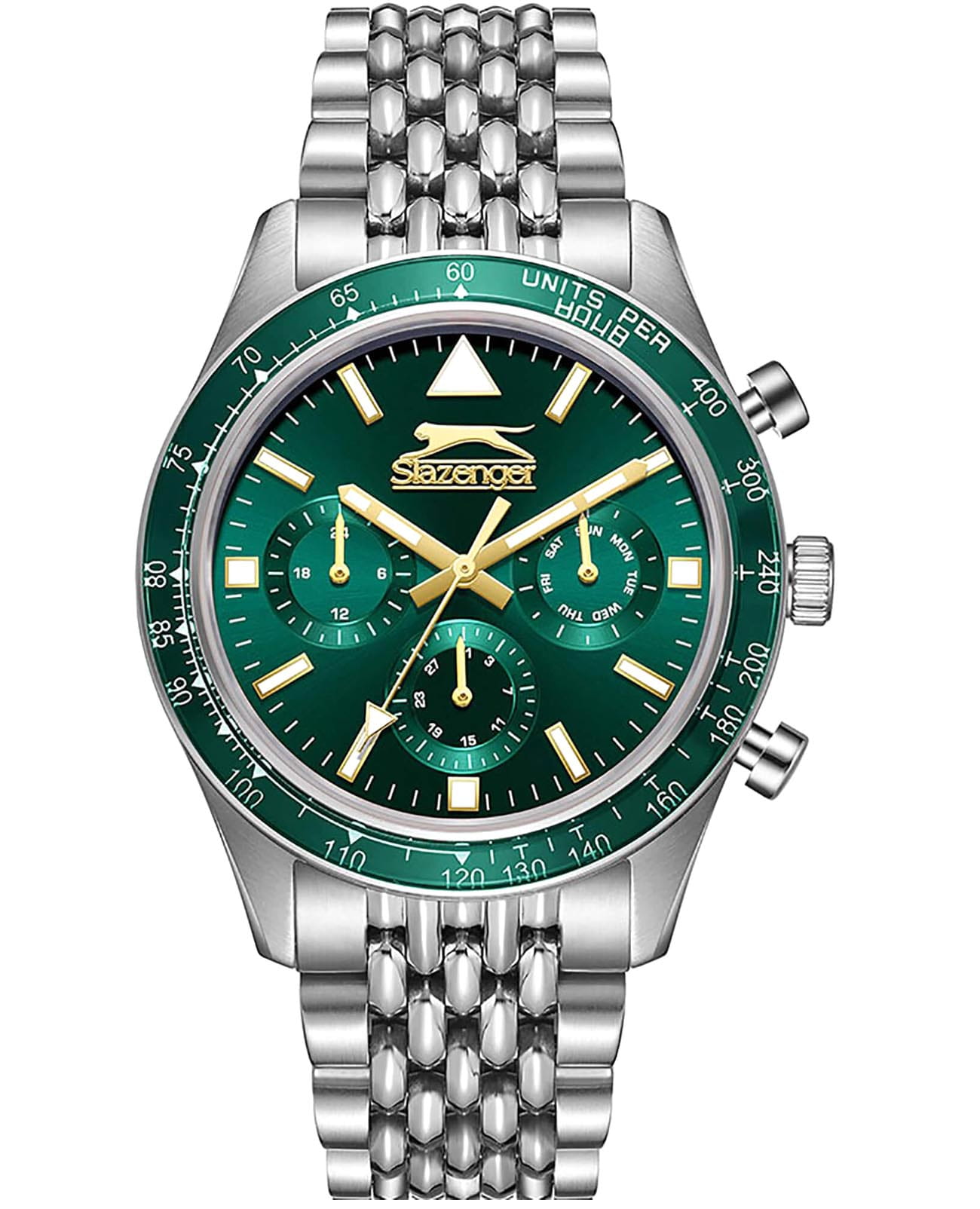 Мужские кварцевые часы Slazenger SL.09.2360.2.04 – идеальное сочетание классического дизайна и современных технологий, созданное для уверенных в себе мужчин. Корпус выполнен из суперметалла серебристого цвета, диаметром 43 мм и толщиной 12 мм, подчёркивает надежность модели и делает их идеальным аксессуаром для любой ситуации – будь то деловая встреча или повседневные выходы. Циферблат надёжно защищён минеральным стекломМинеральное стеклоМинеральное стекло представляет собой искусственно выращенный минерал кварца. Такое стекло отличается особой устойчивостью к повреждениям и царапинам. Уступает по некоторым качествам сапфировому стеклу., которое устойчиво к механическим повреждениям и сохраняет кристальную прозрачность. Неподвижный безельБезельВнешний ободок, закрепляющий стекло. В спортивных часах так называется поворотное кольцо с делениями на циферблате, выполняет роль таймера – замеряет отрезки времени на шкале. Неподвижный безель – элемент декора. Однонаправленно вращающийся безель на дайверских часах позволяет фиксировать моменты погружения и выныривания на поверхность. с IP-покрытиемIP-покрытиеМетод ионного напыления. Демонстрирует повышенную устойчивость к истиранию, окислению и химическим веществам. Под воздействием высокого давления и температуры около 1500°C молекулы металла надёжно соединяются с частицами корпуса часов. зеленого цвета. Стальной браслет на раскладной застёжкеРаскладная застёжкаТакой тип застёжки используется только на браслетах из металла. Она никогда не раскрывается полностью, происходит разделение на 2 и более частей. Раскладывающая застёжка снизит вероятность потери часов к минимуму. удобно облегает запястье, обеспечивая надёжность и комфорт в повседневном ношении. Стрелки и метки покрыты люминесцентным покрытиемЛюминесцентное покрытиеПозволяет считывать показания времени в темноте. Производители наносят на стрелки, часовые индексы, безель или поверхность циферблата светонакопительный состав, дающий холодное свечение., обеспечивающим отличную читаемость в темноте. Эти часы станут не просто аксессуаром, а надежным спутником в любой ситуации, подчеркивая ваш безупречный вкус и деловой стиль. Вынесенный циферблат с 24-х часовым указателем времени и функция тахиметраТахиметрРазмеченная шкала, располагается на ободке или безеле часов. Тахиметр позволяет рассчитать скорость на определённом участке пути, расстояние измеряется в километрах или милях.. Водозащита 50 метров позволит защитить корпус от случайных брызг или капель дождя.