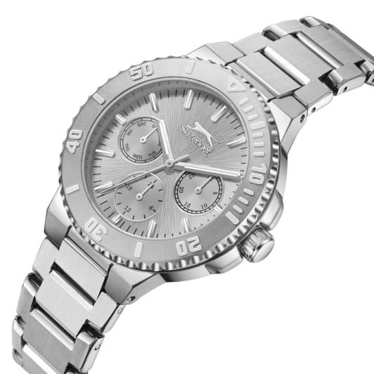 Женские кварцевые часы Slazenger — это выразительный и функциональный аксессуар. Корпус диаметром 36 мм и толщиной 9,5 мм выполнен из суперметалла. Циферблат серебристого цвета оформлен индексами и стрелками. Циферблат защищён минеральным стекломМинеральное стеклоМинеральное стекло представляет собой искусственно выращенный минерал кварца. Такое стекло отличается особой устойчивостью к повреждениям и царапинам. Уступает по некоторым качествам сапфировому стеклу.. Механизм — кварцевый. Часы оснащены индикацией дня недели, даты и 12/24-часового формата времени. Часы оснащены браслетом из суперметалла с раскладной застёжкойРаскладная застёжкаТакой тип застёжки используется только на браслетах из металла. Она никогда не раскрывается полностью, происходит разделение на 2 и более частей. Раскладывающая застёжка снизит вероятность потери часов к минимуму.. Водонепроницаемость 50 м позволяет использовать часы в повседневных условиях. Гарантия — 12 месяцев. Идеальный выбор для тех, кто ценит стиль, функциональность и качество.