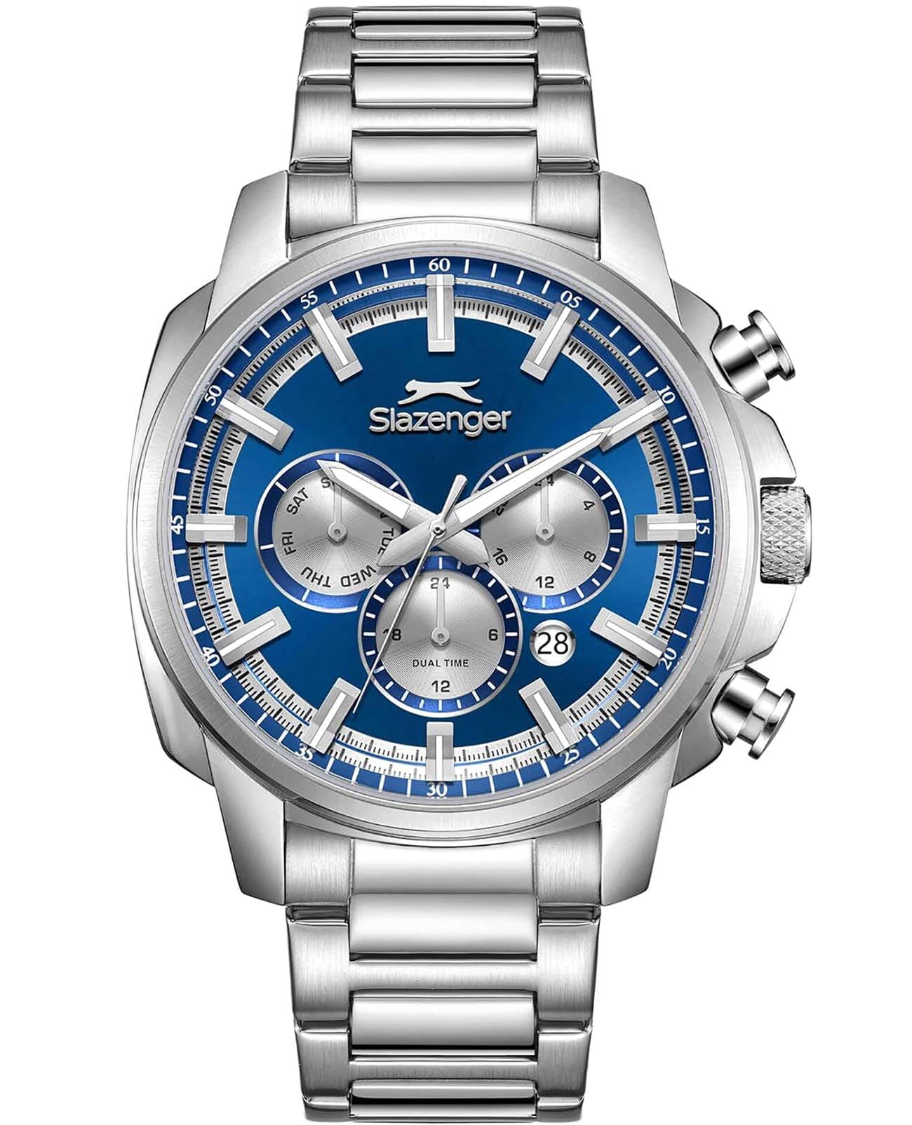 Мужские кварцевые часы Slazenger — это выразительный и функциональный аксессуар. Корпус диаметром 43 мм и толщиной 13,5 мм выполнен из нержавеющей стали 316L. Циферблат синего цвета оформлен индексами и стрелками. Циферблат защищён минеральным стекломМинеральное стеклоМинеральное стекло представляет собой искусственно выращенный минерал кварца. Такое стекло отличается особой устойчивостью к повреждениям и царапинам. Уступает по некоторым качествам сапфировому стеклу.. Механизм — кварцевый. Часы оснащены индикацией дня недели, даты, 12/24-часового формата времени и функцией второго часового пояса (GMT)Второй часовой поясФункция, позволяющая отображать время двух часовых поясов одновременно.. Окошко даты расположено между 4 и 5 часами. Часы оснащены стальным браслетом с раскладной застёжкойРаскладная застёжкаТакой тип застёжки используется только на браслетах из металла. Она никогда не раскрывается полностью, происходит разделение на 2 и более частей. Раскладывающая застёжка снизит вероятность потери часов к минимуму.. Водонепроницаемость 100 м позволяет использовать часы для плавания и повседневного ношения. Гарантия — 12 месяцев. Идеальный выбор для тех, кто ценит стиль, функциональность и качество.