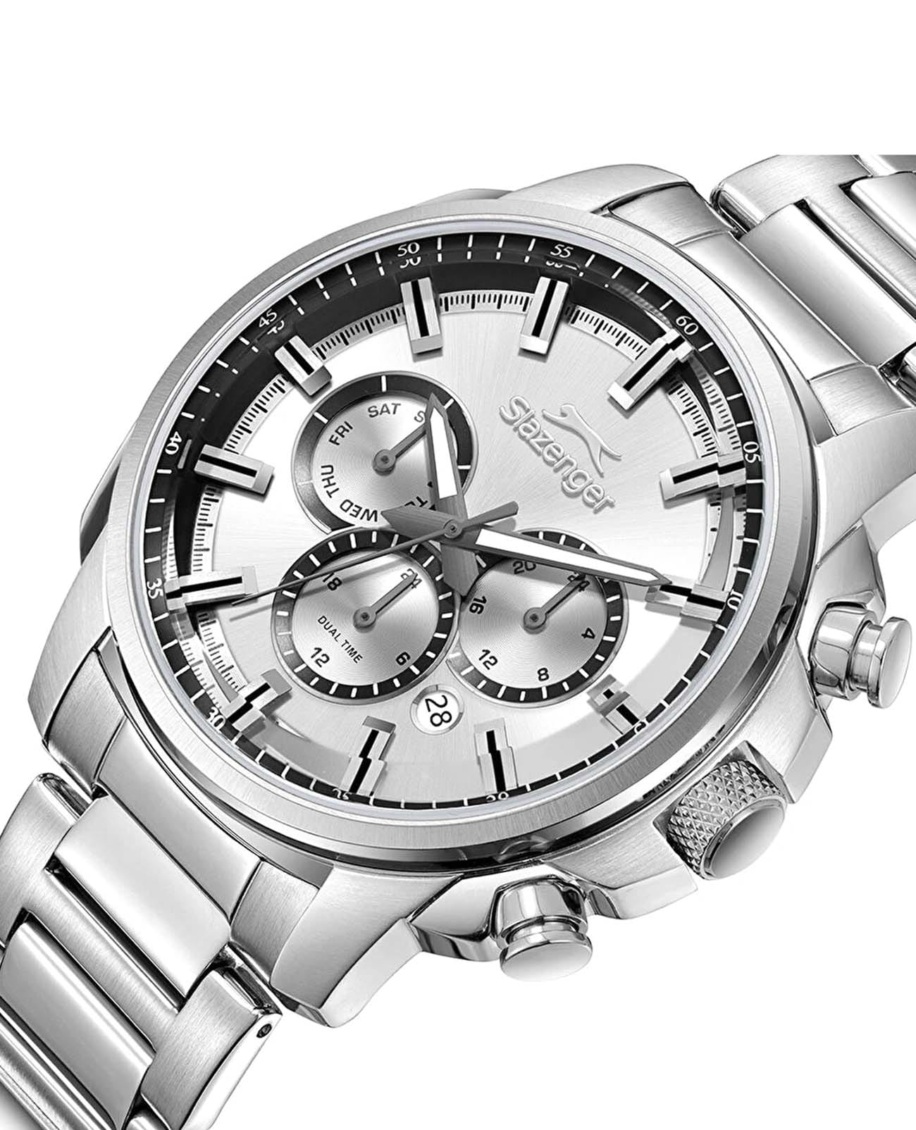 Мужские кварцевые часы Slazenger — это выразительный и функциональный аксессуар. Корпус диаметром 43 мм и толщиной 13,5 мм выполнен из нержавеющей стали 316L. Циферблат серебристого цвета оформлен индексами и стрелками. Циферблат защищён минеральным стекломМинеральное стеклоМинеральное стекло представляет собой искусственно выращенный минерал кварца. Такое стекло отличается особой устойчивостью к повреждениям и царапинам. Уступает по некоторым качествам сапфировому стеклу.. Механизм — кварцевый. Часы оснащены индикацией дня недели, даты, 12/24-часового формата времени и функцией второго часового пояса (GMT)Второй часовой поясФункция, позволяющая отображать время двух часовых поясов одновременно.. Окошко даты расположено между 4 и 5 часами. Часы оснащены стальным браслетом с раскладной застёжкойРаскладная застёжкаТакой тип застёжки используется только на браслетах из металла. Она никогда не раскрывается полностью, происходит разделение на 2 и более частей. Раскладывающая застёжка снизит вероятность потери часов к минимуму.. Водонепроницаемость 100 м позволяет использовать часы для плавания и повседневного ношения. Гарантия — 12 месяцев. Идеальный выбор для тех, кто ценит стиль, функциональность и качество.