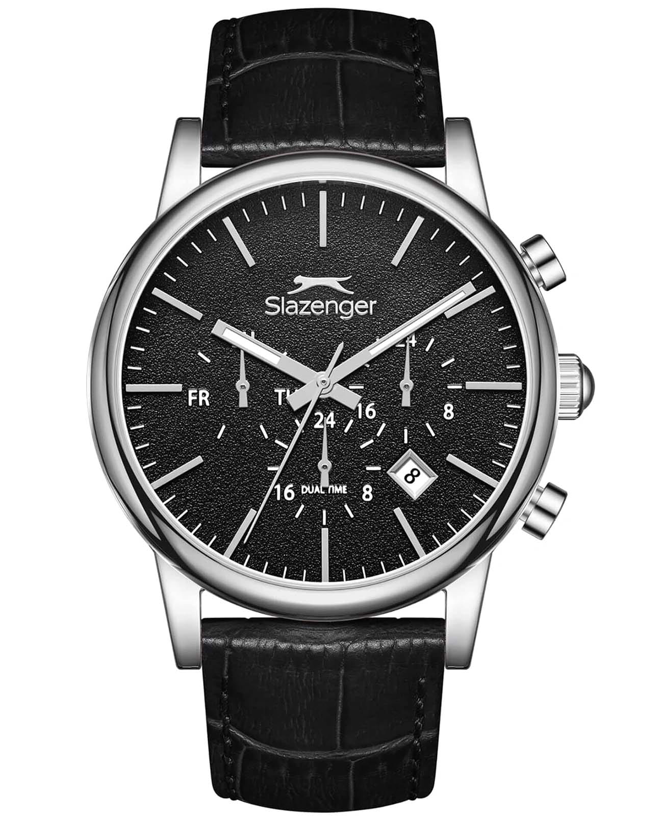 Мужские кварцевые часы Slazenger — это выразительный и функциональный аксессуар. Корпус диаметром 43 мм и толщиной 12 мм выполнен из нержавеющей стали 316L. Циферблат чёрного цвета оформлен индексами и стрелками. Циферблат защищён минеральным стекломМинеральное стеклоМинеральное стекло представляет собой искусственно выращенный минерал кварца. Такое стекло отличается особой устойчивостью к повреждениям и царапинам. Уступает по некоторым качествам сапфировому стеклу.. Стрелки с люминесцентным покрытиемЛюминесцентное покрытиеПозволяет считывать показания времени в темноте. Производители наносят на стрелки, часовые индексы, безель или поверхность циферблата светонакопительный состав, дающий холодное свечение., обеспечивающим хорошую читаемость в темноте. Механизм — кварцевый. Часы оснащены индикацией дня недели, даты, 12/24-часового формата времени и функцией второго часового пояса (GMT)Второй часовой поясФункция, позволяющая отображать время двух часовых поясов одновременно.. Окошко даты расположено между 4 и 5 часами. Часы оснащены кожаным ремешком с стандартной застёжкой. Водонепроницаемость 100 м позволяет использовать часы для плавания и повседневного ношения. Гарантия — 12 месяцев. Идеальный выбор для тех, кто ценит стиль, функциональность и качество.