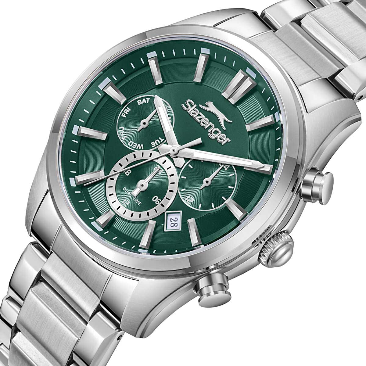 Мужские кварцевые часы Slazenger — это выразительный и функциональный аксессуар. Корпус диаметром 43 мм и толщиной 12 мм выполнен из нержавеющей стали 316L. Циферблат зелёного цвета оформлен индексами и стрелками с люминесцентным покрытиемЛюминесцентное покрытиеПозволяет считывать показания времени в темноте. Производители наносят на стрелки, часовые индексы, безель или поверхность циферблата светонакопительный состав, дающий холодное свечение., обеспечивающим хорошую читаемость в темноте. Циферблат защищён минеральным стекломМинеральное стеклоМинеральное стекло представляет собой искусственно выращенный минерал кварца. Такое стекло отличается особой устойчивостью к повреждениям и царапинам. Уступает по некоторым качествам сапфировому стеклу.. Механизм — кварцевый калибр JP25. Часы оснащены индикацией дня недели, даты, 12/24-часового формата времени и функцией второго часового пояса (GMT)Второй часовой поясФункция, позволяющая отображать время двух часовых поясов одновременно.. Окошко даты расположено между 4 и 5 часами. Часы оснащены стальным браслетом из нержавеющей стали 316L с раскладной застёжкойРаскладная застёжкаТакой тип застёжки используется только на браслетах из металла. Она никогда не раскрывается полностью, происходит разделение на 2 и более частей. Раскладывающая застёжка снизит вероятность потери часов к минимуму.. Водонепроницаемость 100 м позволяет использовать часы для плавания и повседневного ношения. Гарантия — 12 месяцев. Идеальный выбор для тех, кто ценит стиль, функциональность и качество.