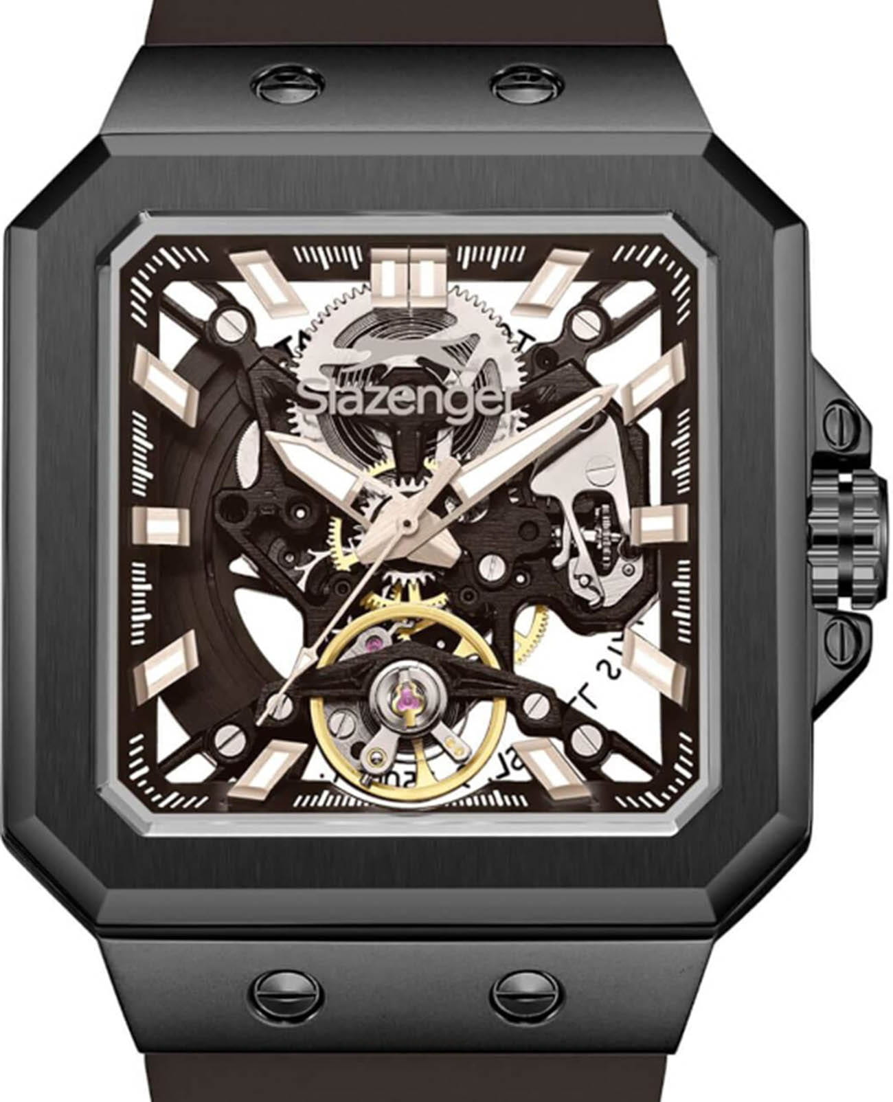 Мужские механические часы с автоподзаводом Slazenger — это выразительный и функциональный аксессуар. Корпус размером 40×51 мм и толщиной 14 мм выполнен из нержавеющей стали 316L с IP-покрытиемIP-покрытиеМетод ионного напыления. Демонстрирует повышенную устойчивость к истиранию, окислению и химическим веществам. Под воздействием высокого давления и температуры около 1500°C молекулы металла надёжно соединяются с частицами корпуса часов.. Циферблат чёрного цвета частично скелетонизирован, что позволяет наблюдать за работой механизма. Циферблат защищён минеральным стекломМинеральное стеклоМинеральное стекло представляет собой искусственно выращенный минерал кварца. Такое стекло отличается особой устойчивостью к повреждениям и царапинам. Уступает по некоторым качествам сапфировому стеклу.. Прозрачная задняя крышка открывает вид на механизм. Стрелки и метки с люминесцентным покрытиемЛюминесцентное покрытиеПозволяет считывать показания времени в темноте. Производители наносят на стрелки, часовые индексы, безель или поверхность циферблата светонакопительный состав, дающий холодное свечение., обеспечивающим хорошую читаемость в темноте. Часы оснащены силиконовым ремешком с стандартной застёжкой. Водонепроницаемость 100 м позволяет использовать часы для плавания и повседневного ношения. Гарантия — 12 месяцев. Идеальный выбор для тех, кто ценит стиль, технологичность и качество.