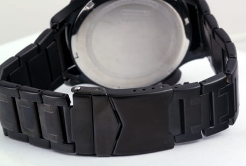 Водозащита 50 метров (5 ATM) защищает часы от брызг и дождя. Браслет из нержавеющей стали с PVD-покрытиемPVDУльтратонкое покрытие наносится в технике вакуумного напыления, сочетает в себе нитрид титана особой прочности со слоем золота или оксида хрома. Несёт в себе декоративную или защитную функцию. и застёжкой раскладной застёжкойРаскладная застёжкаТакой тип застёжки используется только на браслетах из металла. Она никогда не раскрывается полностью, происходит разделение на 2 и более частей. Раскладывающая застёжка снизит вероятность потери часов к минимуму. с системой блокировки обеспечивает комфортное ношение и надёжную фиксацию на запястье.