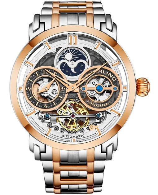 Мужские наручные часы Stührling Original 371B.05 из коллекции Luciano Automatic Skeleton сочетают в себе классический дизайн и современные технологии . Модель оснащена механическим механизмом с автоподзаводом, что гарантирует точность хода без необходимости ручного завода . Корпус часов диаметром 46 мм изготовлен из нержавеющей стали, что подчеркивает элегантность модели . БезельБезельВнешний ободок, закрепляющий стекло. В спортивных часах так называется поворотное кольцо с делениями на циферблате, выполняет роль таймера – замеряет отрезки времени на шкале. Неподвижный безель – элемент декора. Однонаправленно вращающийся безель на дайверских часах позволяет фиксировать моменты погружения и выныривания на поверхность. с PVD-покрытиемPVDУльтратонкое покрытие наносится в технике вакуумного напыления, сочетает в себе нитрид титана особой прочности со слоем золота или оксида хрома. Несёт в себе декоративную или защитную функцию.. Защиту циферблата обеспечивает прочное стекло KrysternaKrysternaKrysterna — инновационное стекло для наручных часов. Благодаря уникальной структуре, Krysterna объединяет ключевые преимущества двух материалов: твердость сапфира, защищающую от царапин, и гибкость минерального стекла, обеспечивающую устойчивость к деформациям. Такая комбинация делает его идеальным решением для часов, подверженных экстремальным нагрузкам, сохраняя при этом оптическую прозрачность., известное своей устойчивостью к царапинам и механическим повреждениям . Циферблат выполнен в стиле , что позволяет наблюдать за работой внутреннего механизма и демонстрирует сложность инженерного решения . Такой дизайн делает модель не только функциональной, но и стильной, привлекая внимание ценителей сложных технических решений. Часы оснащены функцией второго часового поясаВторой часовой поясФункция, позволяющая отображать время двух часовых поясов одновременно. и анимированным индикатором AM/PM в виде солнца и луны, что делает их удобными для путешественников . Водонепроницаемость модели достигает 5 атмосфер (50 метров), что позволяет использовать их в повседневных условиях, включая контакт с водой, например, при мытье рук или дожде . Заводная головка с системой завинчивания обеспечивает дополнительную защиту механизма от внешних воздействий.