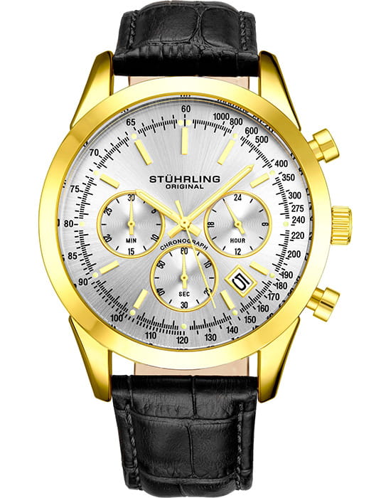 Stuhrling 3975L.4 — стильные мужские часы с выразительным пилотским дизайном и мощным функционалом. Классический циферблат дополнен контрастными счётчиками хронографаХронографФункция позволяет измерять отрезки времени с особой точностью: часы, минуты, секунды. Верным признаком хронографа является наличие на циферблате 3 дополнительных окошек-счётчиков., тахиметрической шкалой по ободу и аккуратным окошком даты, подчёркивающими технический характер модели. Корпус из нержавеющей стали с PVD-покрытиемPVDУльтратонкое покрытие наносится в технике вакуумного напыления, сочетает в себе нитрид титана особой прочности со слоем золота или оксида хрома. Несёт в себе декоративную или защитную функцию. придаёт часам надёжность и современный блеск, а стекло KrysternaKrysternaKrysterna — инновационное стекло для наручных часов. Благодаря уникальной структуре, Krysterna объединяет ключевые преимущества двух материалов: твердость сапфира, защищающую от царапин, и гибкость минерального стекла, обеспечивающую устойчивость к деформациям. Такая комбинация делает его идеальным решением для часов, подверженных экстремальным нагрузкам, сохраняя при этом оптическую прозрачность. защищает поверхность от царапин и сохраняет кристальную прозрачность. Кожаный ремень с классической текстурой аллигатора и стандартной застежкой, обеспечивает комфорт и элегантную посадку на запястье. Stuhrling — гармония силы, точности и изысканного стиля для мужчин, ценящих уверенность и безупречный вкус.