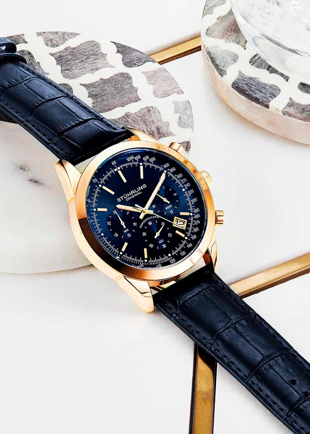 Stuhrling 3975L.7 — стильные мужские часы с выразительным пилотским дизайном и мощным функционалом. Классический циферблат дополнен контрастными счётчиками хронографаХронографФункция позволяет измерять отрезки времени с особой точностью: часы, минуты, секунды. Верным признаком хронографа является наличие на циферблате 3 дополнительных окошек-счётчиков., тахиметрической шкалой по ободу и аккуратным окошком даты, подчёркивающими технический характер модели. Корпус из нержавеющей стали с PVD-покрытиемPVDУльтратонкое покрытие наносится в технике вакуумного напыления, сочетает в себе нитрид титана особой прочности со слоем золота или оксида хрома. Несёт в себе декоративную или защитную функцию. придаёт часам надёжность и современный блеск, а стекло KrysternaKrysternaKrysterna — инновационное стекло для наручных часов. Благодаря уникальной структуре, Krysterna объединяет ключевые преимущества двух материалов: твердость сапфира, защищающую от царапин, и гибкость минерального стекла, обеспечивающую устойчивость к деформациям. Такая комбинация делает его идеальным решением для часов, подверженных экстремальным нагрузкам, сохраняя при этом оптическую прозрачность. защищает поверхность от царапин и сохраняет кристальную прозрачность. Кожаный ремень с классической текстурой аллигатора и стандартной застежкой, обеспечивает комфорт и элегантную посадку на запястье. Stuhrling — гармония силы, точности и изысканного стиля для мужчин, ценящих уверенность и безупречный вкус.