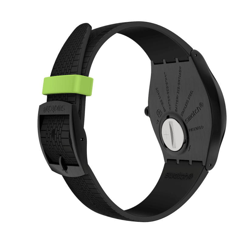 Часы Swatch SS07B108 — это стильный и современный аксессуар для тех, кто ценит лёгкость и комфорт. Часы идеально подойдут как для мужчин, так и для женщин. Эффектность данной модели придает черный циферблат с зелеными индексами и черными стрелками, светящимися в темноте благодаря люминесцентному покрытиюЛюминесцентное покрытиеПозволяет считывать показания времени в темноте. Производители наносят на стрелки, часовые индексы, безель или поверхность циферблата светонакопительный состав, дающий холодное свечение., а также минеральное стеклоМинеральное стеклоМинеральное стекло представляет собой искусственно выращенный минерал кварца. Такое стекло отличается особой устойчивостью к повреждениям и царапинам. Уступает по некоторым качествам сапфировому стеклу.. Эти черные часы дополнены каучуковым ремешком с текстурированной лицевой стороной и зеленым тренчиком, а также матовой пряжкой и корпусом с черным PVDPVDУльтратонкое покрытие наносится в технике вакуумного напыления, сочетает в себе нитрид титана особой прочности со слоем золота или оксида хрома. Несёт в себе декоративную или защитную функцию. покрытием.  Водозащита 30 метров делает часы практичными для повседневного использования. Эти часы подойдут для повседневного ношения и станут ярким акцентом в вашем наряде.