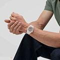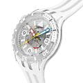 Мужские дайверские часы Swatch AURELIA AURITA SSCU09K100 — это стильный и современный аксессуар для тех, кто ценит лёгкость и комфорт. Корпус выполнен из биокерамики, который состоит из матовых и блестящих прозрачных частей из биоматериала, диаметром 44 мм и толщиной 15.4 мм, что обеспечивает долговечность и утончённый внешний вид. Циферблат защищён органическим стеклом, устойчивым к повреждениям. Модель оснащена кварцевым механизмом, обеспечивающим высокую точность хода. БезельБезельВнешний ободок, закрепляющий стекло. В спортивных часах так называется поворотное кольцо с делениями на циферблате, выполняет роль таймера – замеряет отрезки времени на шкале. Неподвижный безель – элемент декора. Однонаправленно вращающийся безель на дайверских часах позволяет фиксировать моменты погружения и выныривания на поверхность. из белого просвечивающего биоматериала с серо-белым принтом, светящимся в темноте, и белая матовая заводная головка из биокерамики, размещенная в районе отметки 10 часов. Стрелки и метки с люминесцентным покрытиемЛюминесцентное покрытиеПозволяет считывать показания времени в темноте. Производители наносят на стрелки, часовые индексы, безель или поверхность циферблата светонакопительный состав, дающий холодное свечение.. Силиконовый ремешок на стандартной застёжке гармонично дополняет корпус и обеспечивает комфортное ношение. Водозащита 100 метров позволит плавать, нырять и заниматься другими водными видами спорта. Эти часы подойдут для повседневного ношения и станут ярким акцентом в вашем наряде.