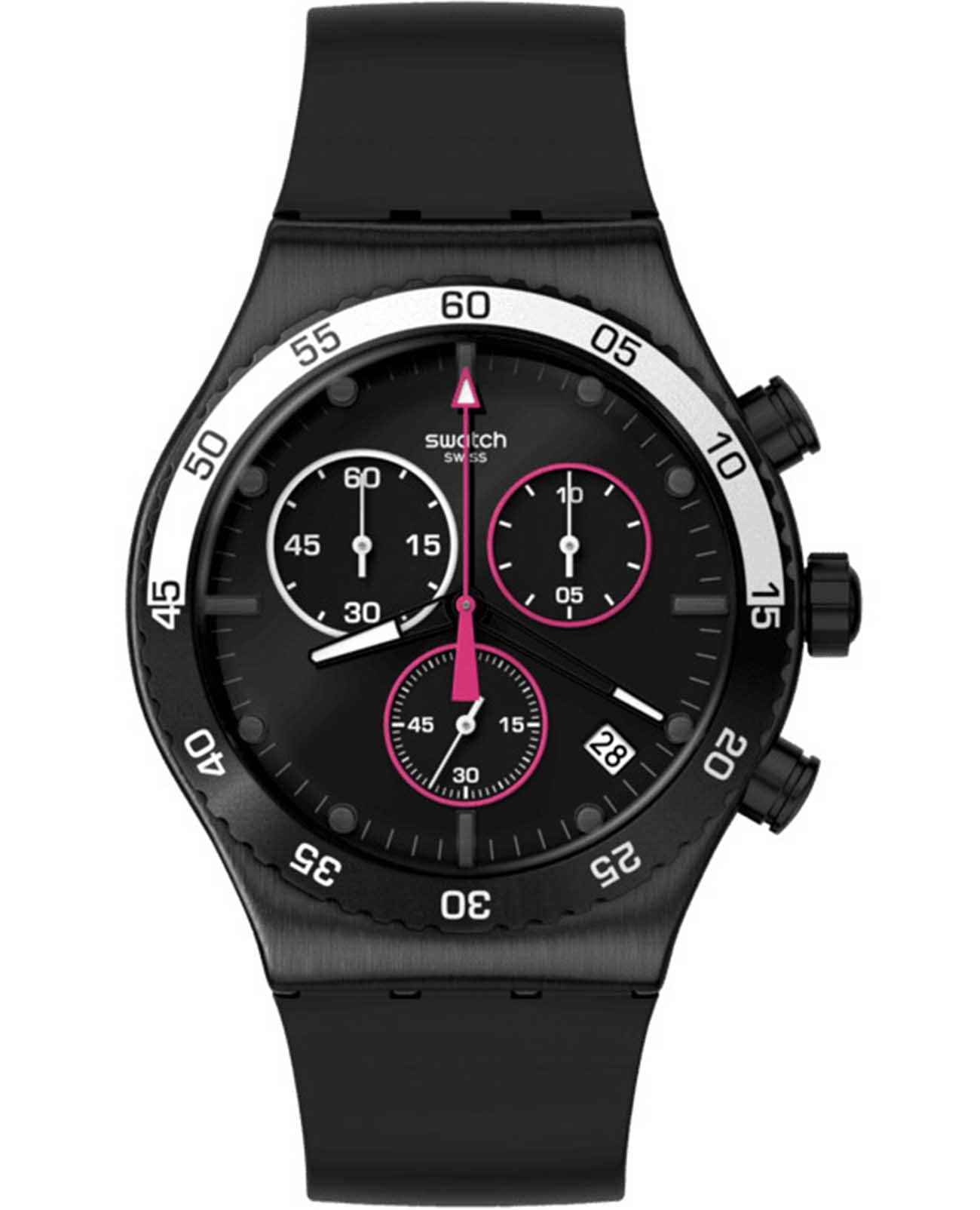 Часы Swatch YVB413 — это стильный и современный аксессуар для тех, кто ценит лёгкость и комфорт. Этот стильный хронографХронографФункция позволяет измерять отрезки времени с особой точностью: часы, минуты, секунды. Верным признаком хронографа является наличие на циферблате 3 дополнительных окошек-счётчиков. из нержавеющей стали с PVDPVDУльтратонкое покрытие наносится в технике вакуумного напыления, сочетает в себе нитрид титана особой прочности со слоем золота или оксида хрома. Несёт в себе декоративную или защитную функцию. покрытием имеет безельБезельВнешний ободок, закрепляющий стекло. В спортивных часах так называется поворотное кольцо с делениями на циферблате, выполняет роль таймера – замеряет отрезки времени на шкале. Неподвижный безель – элемент декора. Однонаправленно вращающийся безель на дайверских часах позволяет фиксировать моменты погружения и выныривания на поверхность. матовый корпус и блестящий черный циферблат, на фоне которого ярко выделяется розовая секундная стрелка и светящиеся в темноте элементы благодаря люминесцентному покрытиюЛюминесцентное покрытиеПозволяет считывать показания времени в темноте. Производители наносят на стрелки, часовые индексы, безель или поверхность циферблата светонакопительный состав, дающий холодное свечение.. Каучуковый ремешок делает эти часы настоящей классикой. Водозащита 30 метров делает часы практичными для повседневного использования. Эти часы подойдут для повседневного ношения и станут ярким акцентом в вашем наряде.