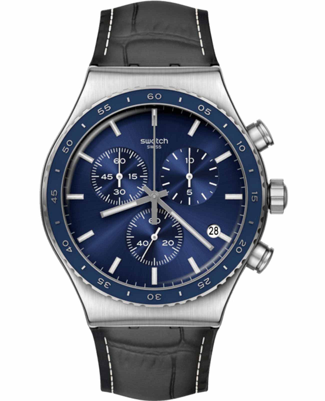 Часы Swatch YVS496 — это стильный и современный аксессуар для тех, кто ценит лёгкость и комфорт. Этот стильный хронографХронографФункция позволяет измерять отрезки времени с особой точностью: часы, минуты, секунды. Верным признаком хронографа является наличие на циферблате 3 дополнительных окошек-счётчиков. обладает элегантным синим циферблатом с окошком даты в положении «4 часа», заключенны в матовый корпус из нержавеющей стали с полированными элементами. БезельБезельВнешний ободок, закрепляющий стекло. В спортивных часах так называется поворотное кольцо с делениями на циферблате, выполняет роль таймера – замеряет отрезки времени на шкале. Неподвижный безель – элемент декора. Однонаправленно вращающийся безель на дайверских часах позволяет фиксировать моменты погружения и выныривания на поверхность. этих часов с PVDPVDУльтратонкое покрытие наносится в технике вакуумного напыления, сочетает в себе нитрид титана особой прочности со слоем золота или оксида хрома. Несёт в себе декоративную или защитную функцию. покрытием, а кожаный ремешок украшен тиснением, имитирующим кожу аллигатора, и контрастной белой строчкой. На часовую, минутную стрелки нанесено люминесцентное покрытиеЛюминесцентное покрытиеПозволяет считывать показания времени в темноте. Производители наносят на стрелки, часовые индексы, безель или поверхность циферблата светонакопительный состав, дающий холодное свечение., которое светится в темноте, создавая необычное изображение. Водозащита 30 метров делает часы практичными для повседневного использования. Эти часы подойдут для повседневного ношения и станут ярким акцентом в вашем наряде.