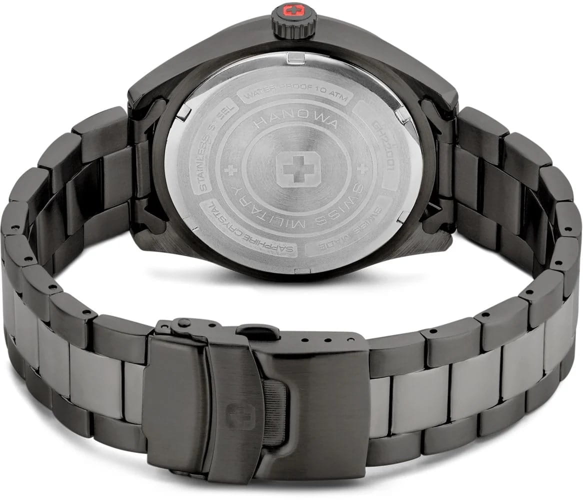 Швейцарские мужские часы Swiss Military Hanowa Afterburn SMWGH2200141, кварцевый механизм с высокой точностью. Сапфировое стеклоСапфировое стеклоПрочный и надёжный материал из кристалла сапфира синтетического происхождения, характеризующийся особой твёрдостью и устойчивостью к царапинам и повреждениям. устойчивое к появлению царапин, обладающее высокой прозрачностью. Класс водозащиты: 100 метров, позволит плавать, нырять и заниматься другими водными видами спорта. Корпус часов изготовлен из стали с PVDPVDУльтратонкое покрытие наносится в технике вакуумного напыления, сочетает в себе нитрид титана особой прочности со слоем золота или оксида хрома. Несёт в себе декоративную или защитную функцию. черного цвета. Раскладная застёжкаРаскладная застёжкаТакой тип застёжки используется только на браслетах из металла. Она никогда не раскрывается полностью, происходит разделение на 2 и более частей. Раскладывающая застёжка снизит вероятность потери часов к минимуму. с фиксатором.