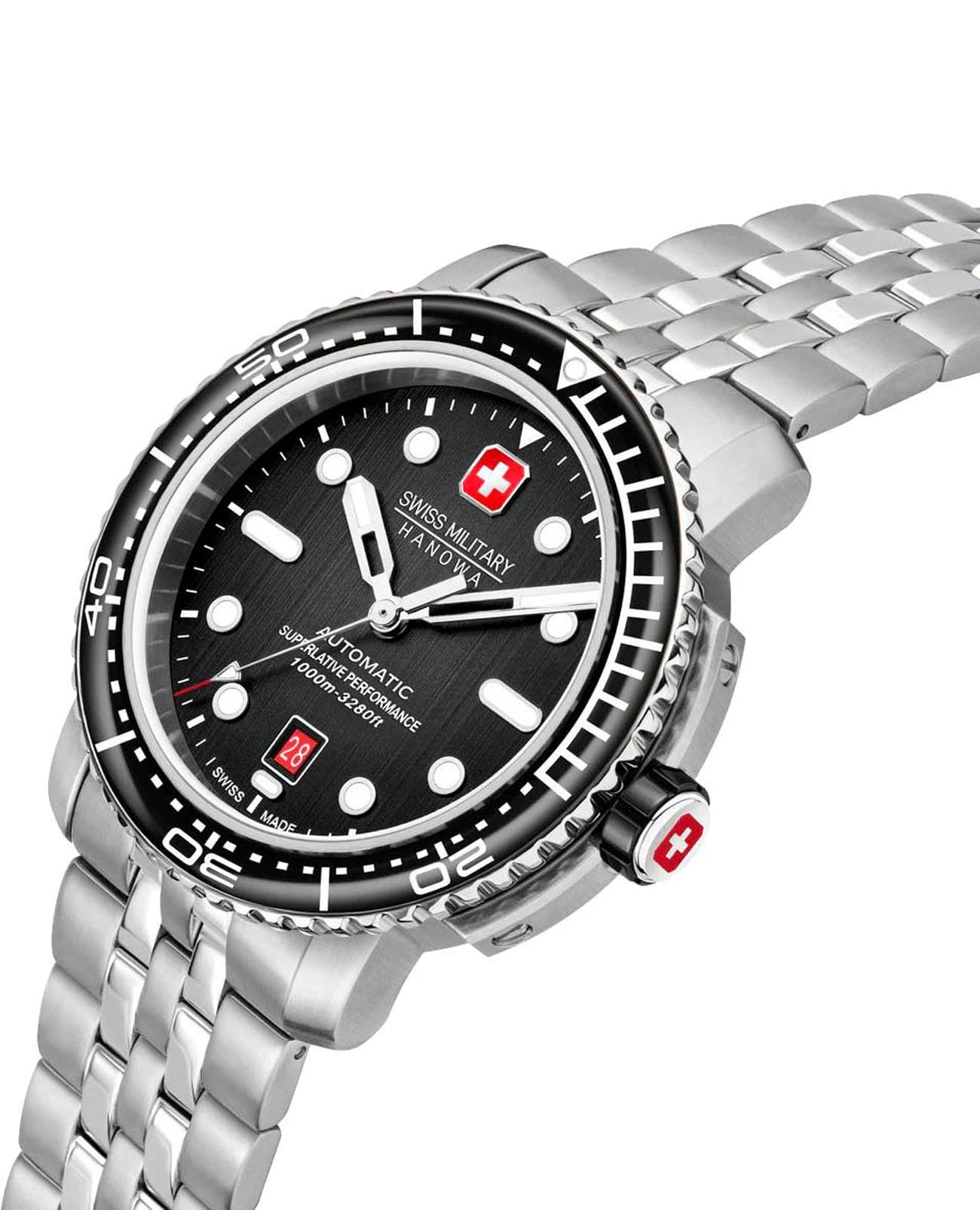 Мужские механические швейцарские часы-хронографХронографФункция позволяет измерять отрезки времени с особой точностью: часы, минуты, секунды. Верным признаком хронографа является наличие на циферблате 3 дополнительных окошек-счётчиков. с автоподзаводом Swiss Military Hanowa Maitre Plongeur SMWGL0002001-SET. Сапфировое стеклоСапфировое стеклоПрочный и надёжный материал из кристалла сапфира синтетического происхождения, характеризующийся особой твёрдостью и устойчивостью к царапинам и повреждениям. устойчивое к появлению царапин, обладающее высокой прозрачностью. Вращающийся безельБезельВнешний ободок, закрепляющий стекло. В спортивных часах так называется поворотное кольцо с делениями на циферблате, выполняет роль таймера – замеряет отрезки времени на шкале. Неподвижный безель – элемент декора. Однонаправленно вращающийся безель на дайверских часах позволяет фиксировать моменты погружения и выныривания на поверхность. из стали с керамической вставкой. Стрелки и метки с люминесцентным покрытиемЛюминесцентное покрытиеПозволяет считывать показания времени в темноте. Производители наносят на стрелки, часовые индексы, безель или поверхность циферблата светонакопительный состав, дающий холодное свечение.. Часы оснащены автоматическим гелиевым клапаном для плавного выравнивания давления при всплытии на поверхность. Окошко даты находится в положении 6 часов. Класс водозащиты: 1000 метров, позволит плавать, нырять и заниматься другими водными видами спорта. Стальной браслет на раскладной застёжкеРаскладная застёжкаТакой тип застёжки используется только на браслетах из металла. Она никогда не раскрывается полностью, происходит разделение на 2 и более частей. Раскладывающая застёжка снизит вероятность потери часов к минимуму.. В комплекте силиконовый ремешок с классический застежкой.