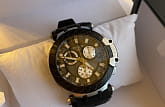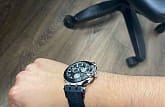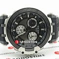 Оригинальный аксессуар в чёрно-серебряном цвете обладает характерными крупными деталями, идёт отсылка к деталям гоночных мотоциклов. Задняя крышка корпуса сделана в виде колеса, безельБезельВнешний ободок, закрепляющий стекло. В спортивных часах так называется поворотное кольцо с делениями на циферблате, выполняет роль таймера – замеряет отрезки времени на шкале. Неподвижный безель – элемент декора. Однонаправленно вращающийся безель на дайверских часах позволяет фиксировать моменты погружения и выныривания на поверхность. напоминает тормозную колодку. Наручные часы оснащены кварцевым механизмом швейцарского производства ETA G10.212. ХронографХронографФункция позволяет измерять отрезки времени с особой точностью: часы, минуты, секунды. Верным признаком хронографа является наличие на циферблате 3 дополнительных окошек-счётчиков. позволяет измерять показатели с особой точностью. Чёрное PVD-покрытиеPVDУльтратонкое покрытие наносится в технике вакуумного напыления, сочетает в себе нитрид титана особой прочности со слоем золота или оксида хрома. Несёт в себе декоративную или защитную функцию. корпуса. Сапфировое стекло. Водостойкость при давлении 10 бар. Секундомер, индикация даты. Люминесцентная подсветкаЛюминесцентное покрытиеПозволяет считывать показания времени в темноте. Производители наносят на стрелки, часовые индексы, безель или поверхность циферблата светонакопительный состав, дающий холодное свечение.. Габариты: 47,6 x 43 x 12,3 мм.