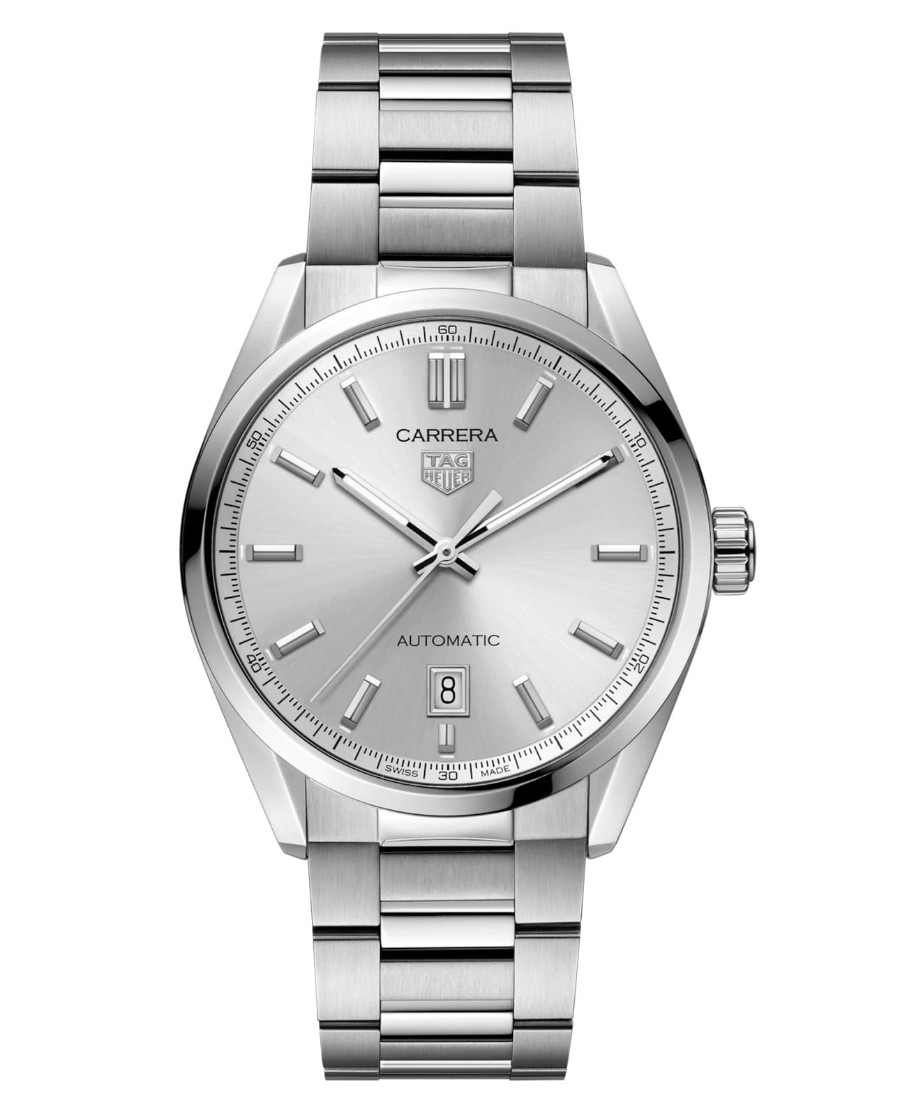 Мужские швейцарские часы TAG Heuer Carrera WBN2111.BA0639, механический механизм (автоматический калибр) с высокой точностью. Сапфировое стекло устойчивое к появлению царапин, обладающее высокой прозрачностью. Класс водозащиты: 100 метров, позволит плавать, нырять и заниматься другими водными видами спорта. Корпус часов изготовлен из стали, серебристого цвета. Матовый серебристый циферблат с узором "солнечные лучи" - олицетворение роскоши, подчеркнутой функциональным и элегантным родиевым логотипом TAG Heuer, стрелками и индексами с покрытием Super-Luminova®.