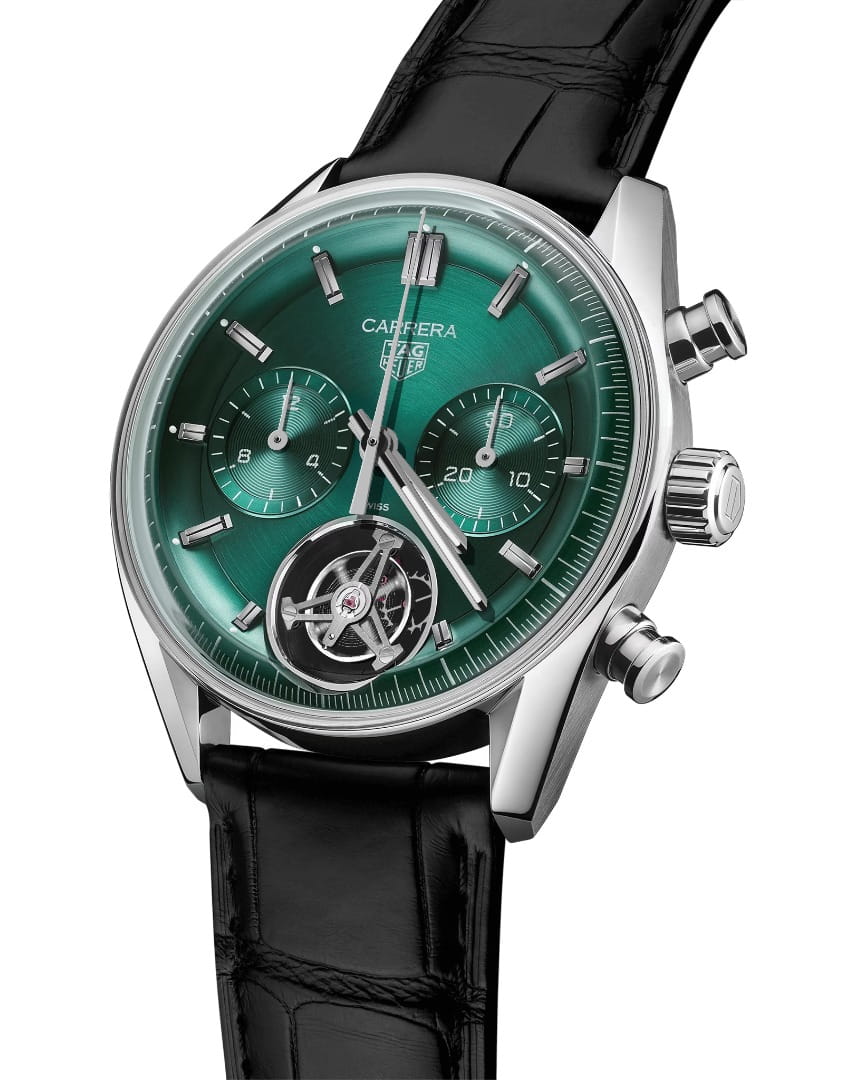 Швейцарские часы-хронографХронографФункция позволяет измерять отрезки времени с особой точностью: часы, минуты, секунды. Верным признаком хронографа является наличие на циферблате 3 дополнительных окошек-счётчиков. TAG Heuer Carrera Chronograph Tourbillon CBS5011.FC6566. Механический механизм (автоматический калибр) с высокой точностью. Сапфировое стеклоСапфировое стеклоПрочный и надёжный материал из кристалла сапфира синтетического происхождения, характеризующийся особой твёрдостью и устойчивостью к царапинам и повреждениям. устойчивое к появлению царапин, обладающее высокой прозрачностью. Стрелки и метки с люминесцентным покрытиемЛюминесцентное покрытиеПозволяет считывать показания времени в темноте. Производители наносят на стрелки, часовые индексы, безель или поверхность циферблата светонакопительный состав, дающий холодное свечение.. Класс водозащиты: 100 метров, позволит плавать, нырять и заниматься другими водными видами спорта. Корпус часов изготовлен из нержавеющей стали. Кожаный ремешок с раскладной застёжкойРаскладная застёжкаТакой тип застёжки используется только на браслетах из металла. Она никогда не раскрывается полностью, происходит разделение на 2 и более частей. Раскладывающая застёжка снизит вероятность потери часов к минимуму..